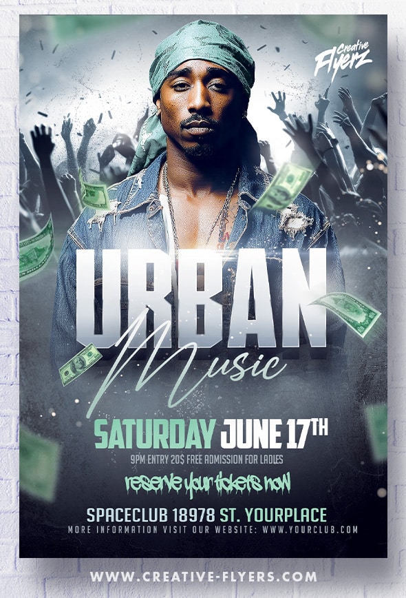 Promotional flyer for an urban music event. The layout features the central image of a man wearing a green bandana. The background is a grayscale cityscape with floating dollar bills, adding a vibrant, urban feel. The text is bold and varied in style: โURBAN Musicโ is in large white graffiti-style font. Perfect for your hip hop event, in a club, a private party or even use this model for a music album cover, or other…