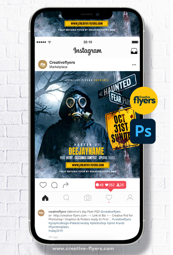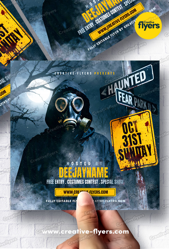 This flyer was created to capture the eerie spirit of Halloween. The design blends fog, moonlight, and a mysterious masked figure to evoke suspense and intrigue. The yellow warning signs add contrast and guide the viewer’s attention. It’s a fully editable flyer template ideal for haunted events, DJ nights, and Halloween parties.