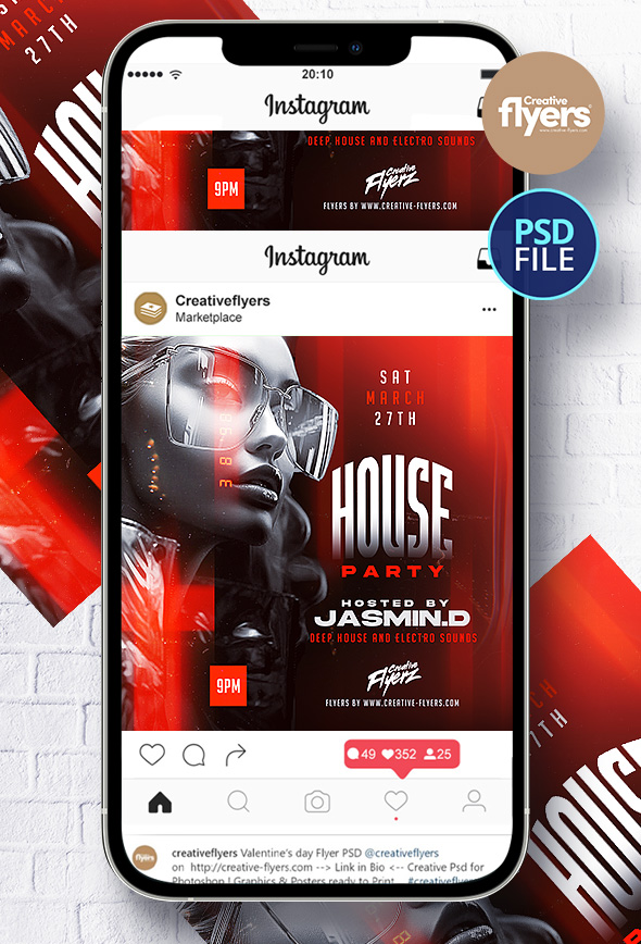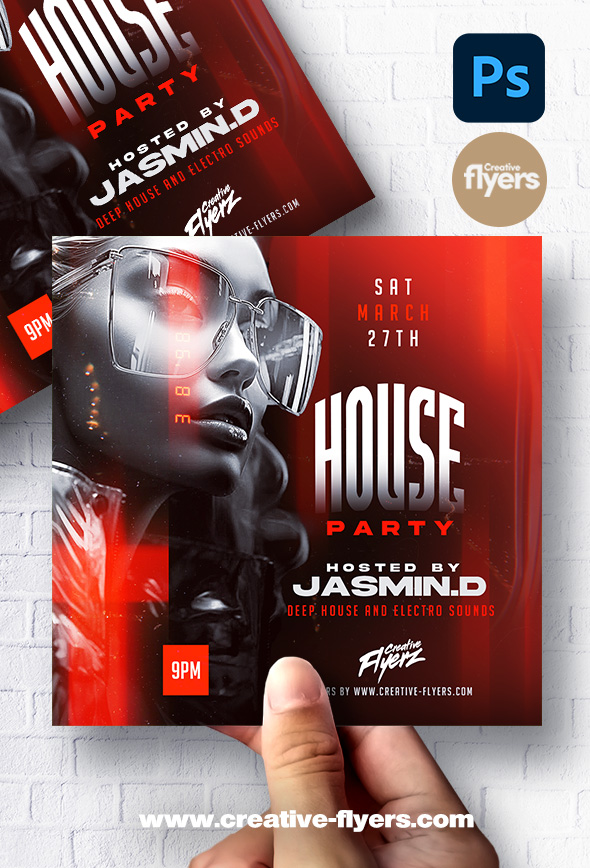 The flyer features an advertisement for a “House” club night, the design of the flyer is captivating with its red and black tones, highlighting important information in white letters. This looks like a flyer for an evening not to be missed for fans of electronic music! ๐