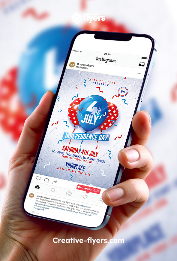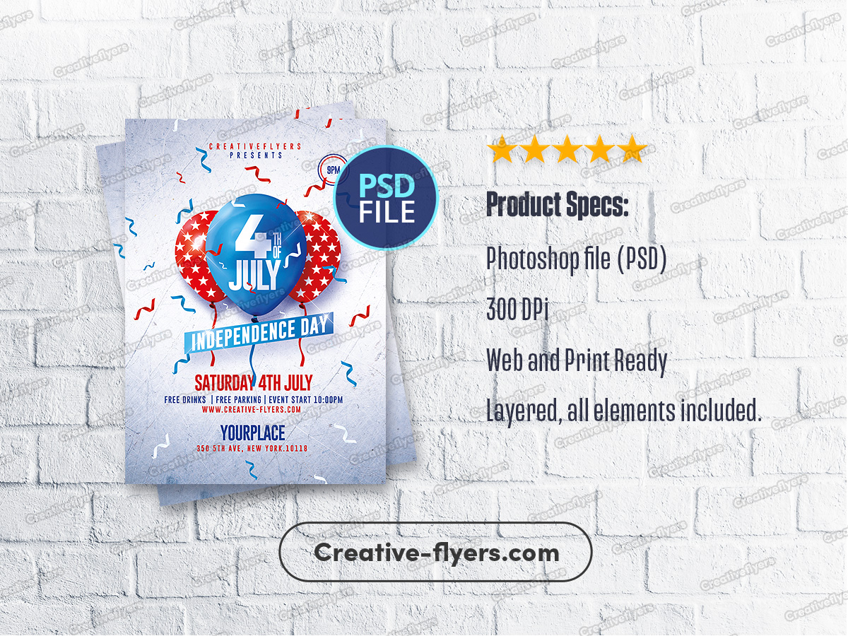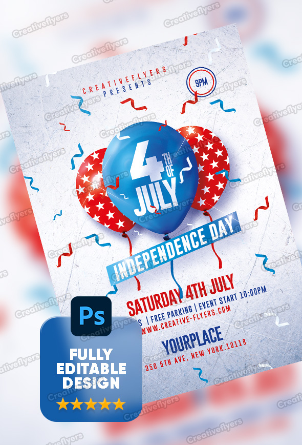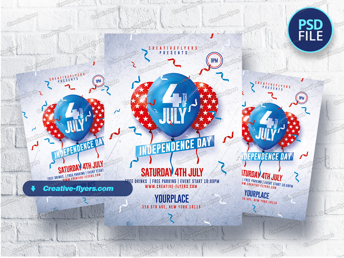 Created for an Independence Day event, this flyer centers around red, white, and blue elements. A large blue balloon anchors the design with supporting heart-shaped graphics. Festive confetti and a crisp background evoke celebration. The layout balances eye-catching visuals with clear event information.