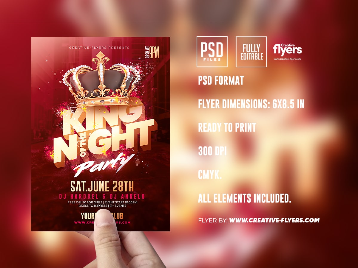 Beautiful flyer template for Photoshop in PSD format, created to announce your next club party, birthday or anniversary private party, a design that has the theme “Night of the king”, with light effects, a 3D title. it can be modified in a few clicks.
