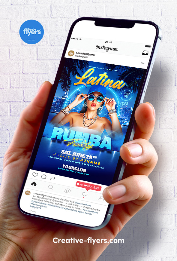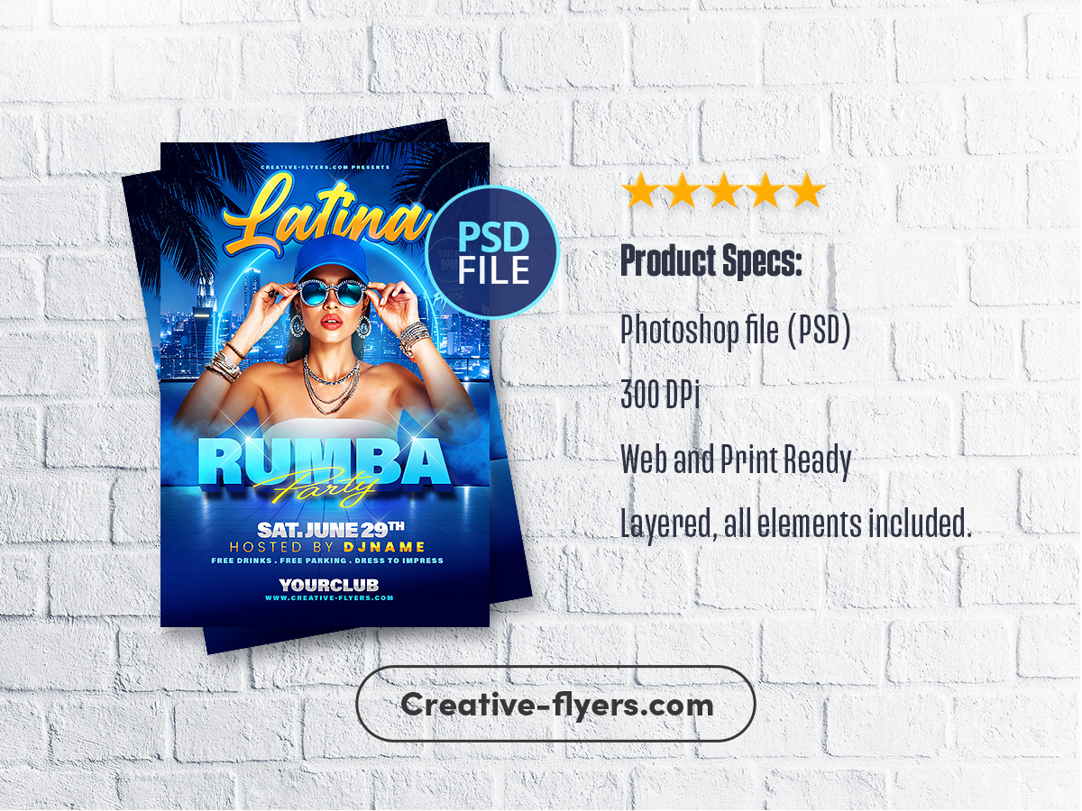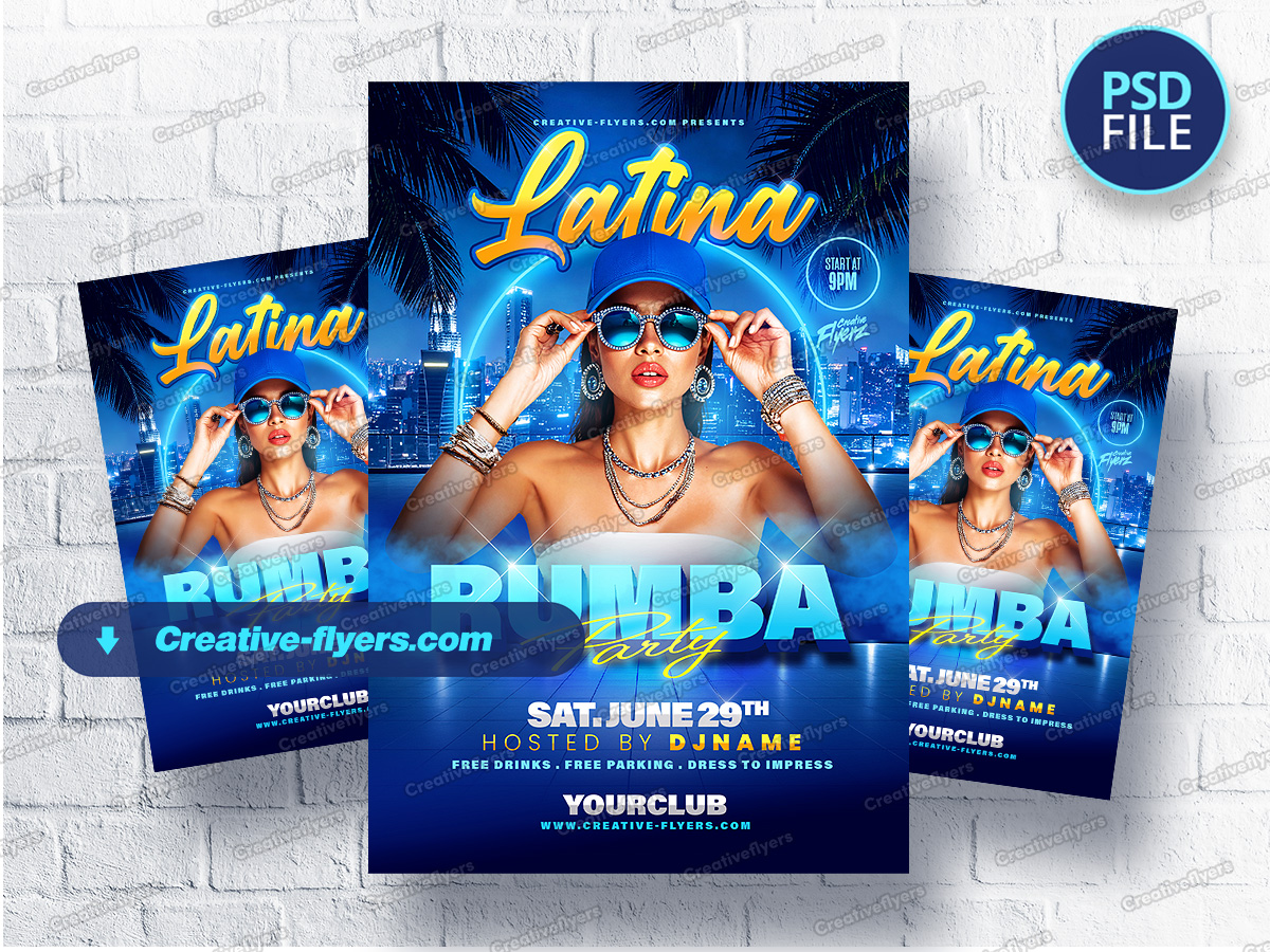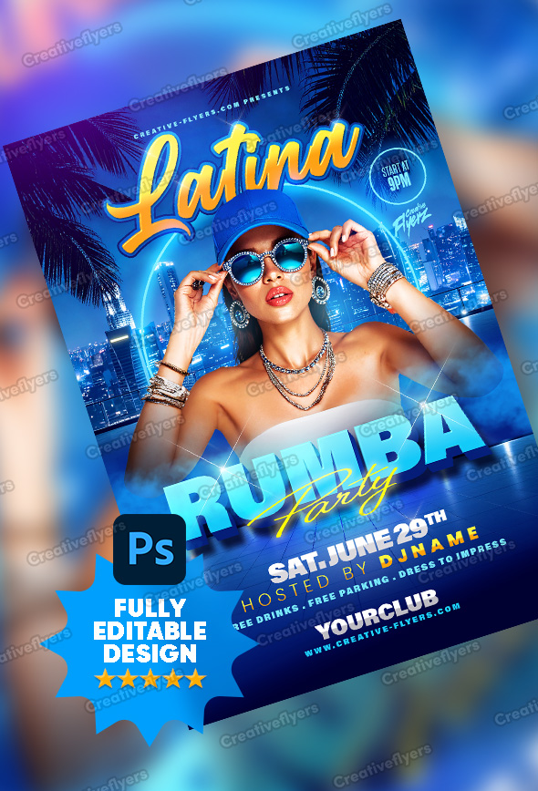 This flyer was designed to radiate Latina flair with a high-energy, tropical nightlife aesthetic. The cityscape meets palm trees and neon blues, contrasted with golden yellows and bold typefaces. The confident model adds an urban glam touch, while the stylish typography makes the event name pop for a memorable Rumba party visual.