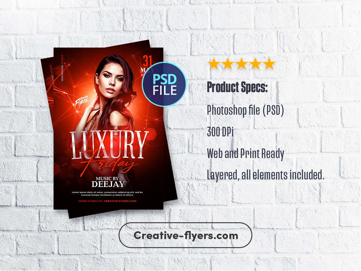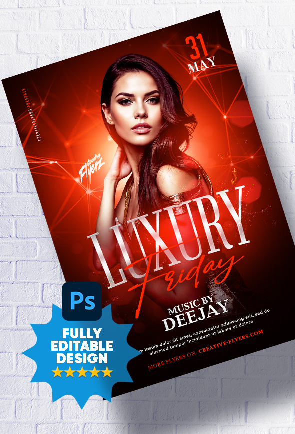 The flyer is designed to promote an event, in a club, bar, private party or other… The style of the flyer is elegant and sophisticated. Black background with red highlights, the colors, typography and images are all chosen to create a luxury impression. The main image of the flyer is a photo of an elegant woman in a dress. Easily adapt this flyer to your party theme, for a birthday, girls’ night, or even Valentine’s Day…