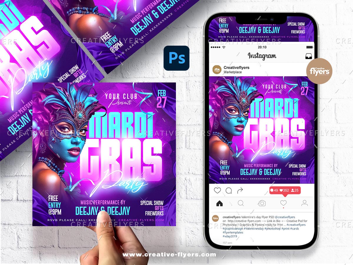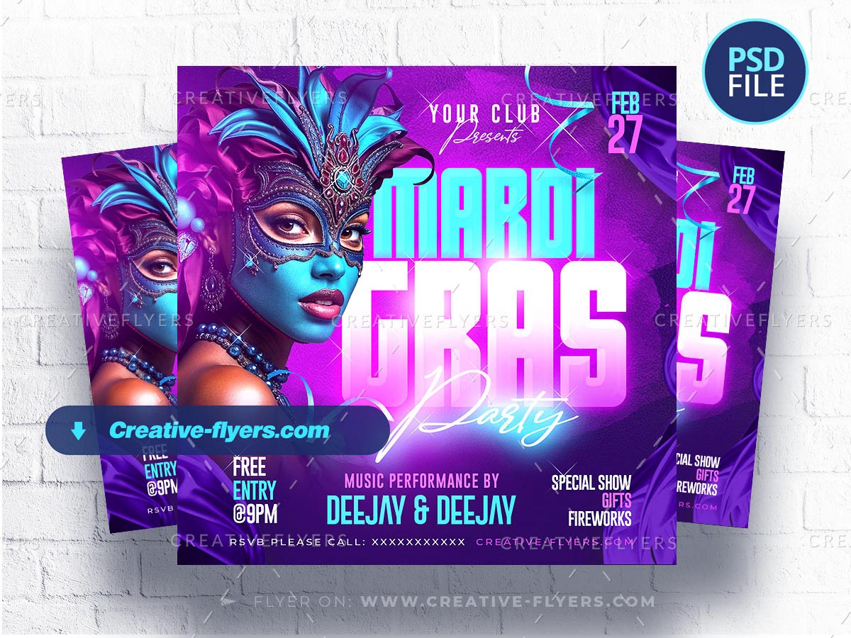 Vibrant flyer featuring a glamorous Mardi Gras celebration.