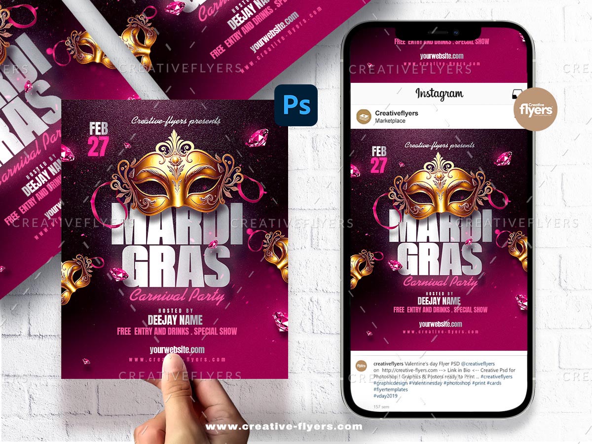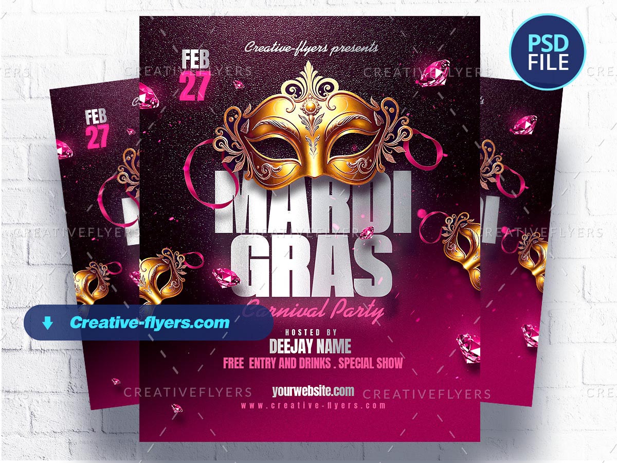 A vibrant Mardi Gras carnival flyer featuring a golden mask.