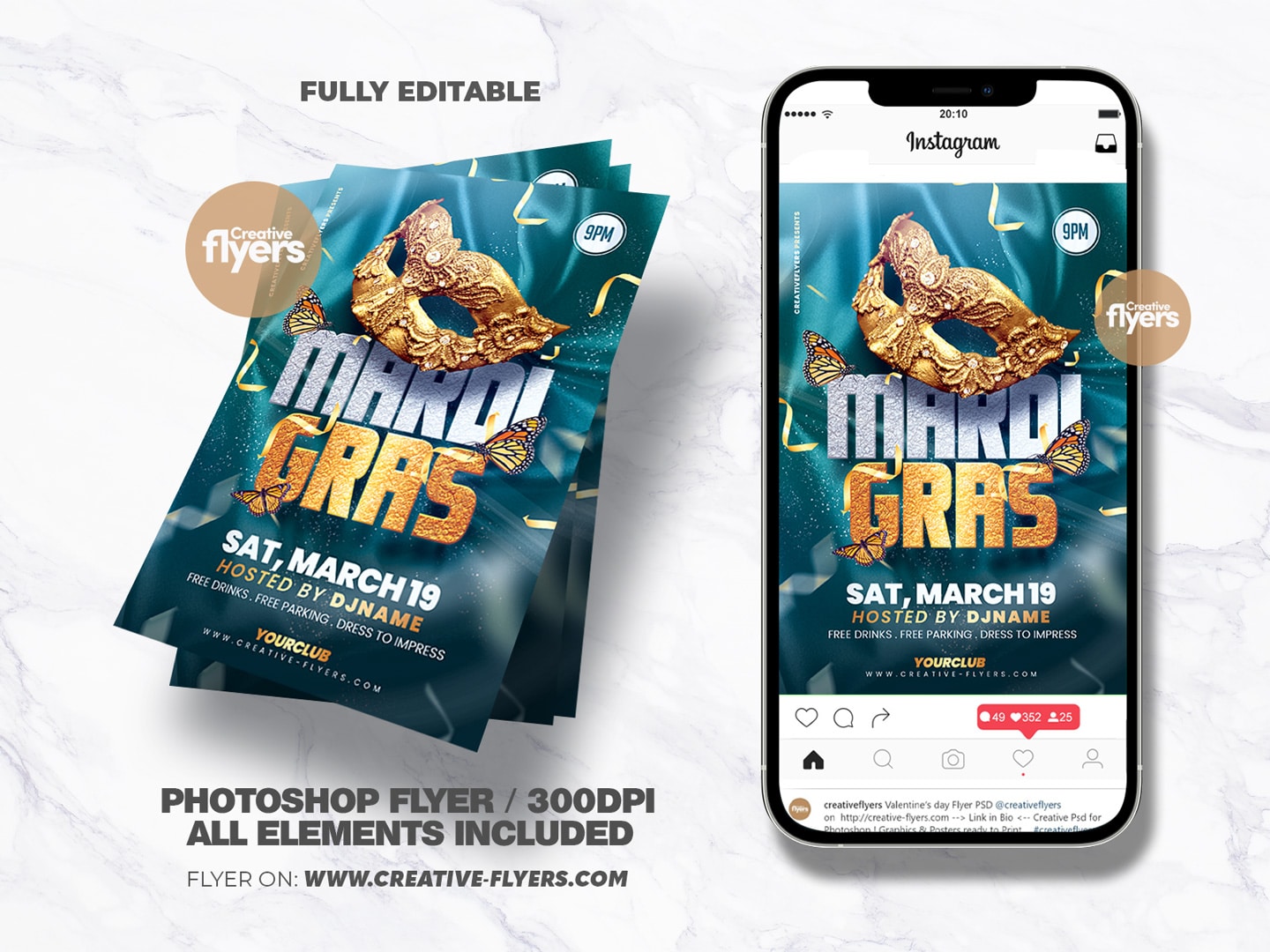 This creative and brilliant Mardi Gras party flyer can help you and is perfect for promoting your next carnival event with just a few clicks. It has a very elegant and sparkling design, with beautiful light and shadow. Download now and have fun for the future “Carnaval” party.