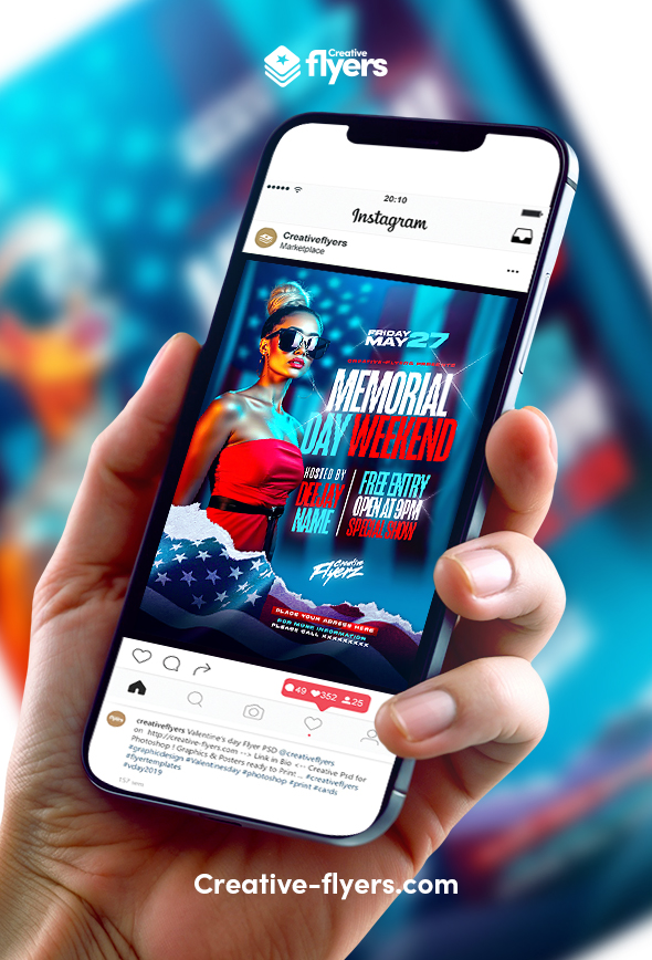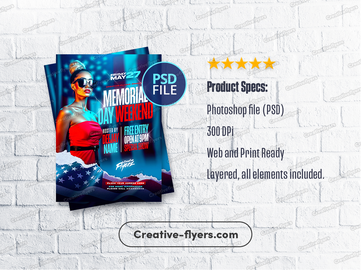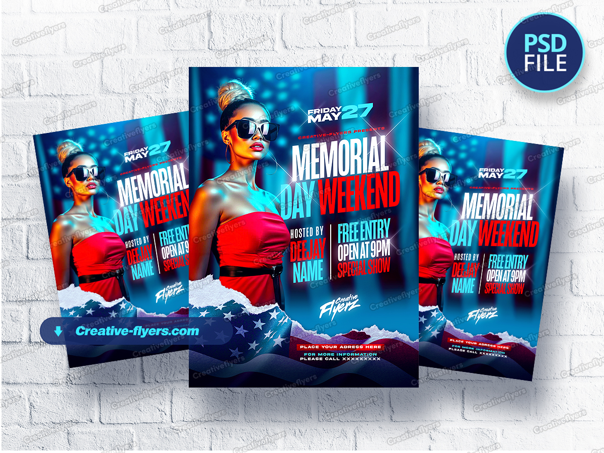 This eye-catching digital flyer was designed to promote a Memorial Day Weekend event. It features a stylish woman in red, set against a backdrop of an American flag, symbolizing patriotism and celebration. Key event details like “FREE ENTRY” and “OPEN AT 9PM” are highlighted, making it easy for potential attendees to grasp essential information. The design aims for a vibrant and inviting feel, perfect for a festive gathering.
