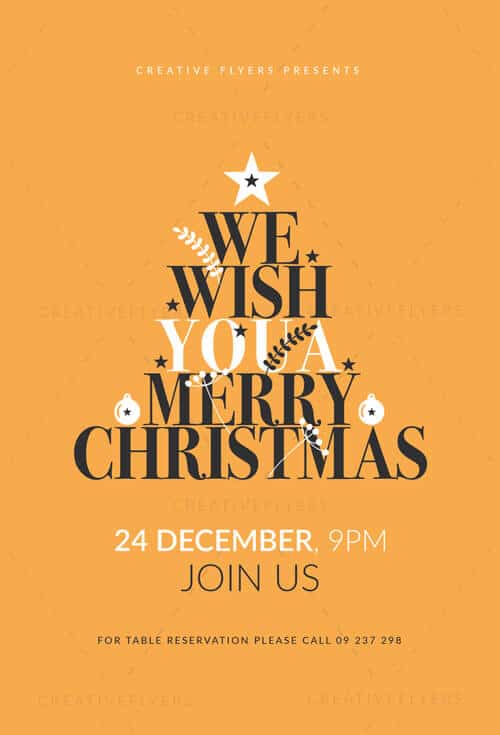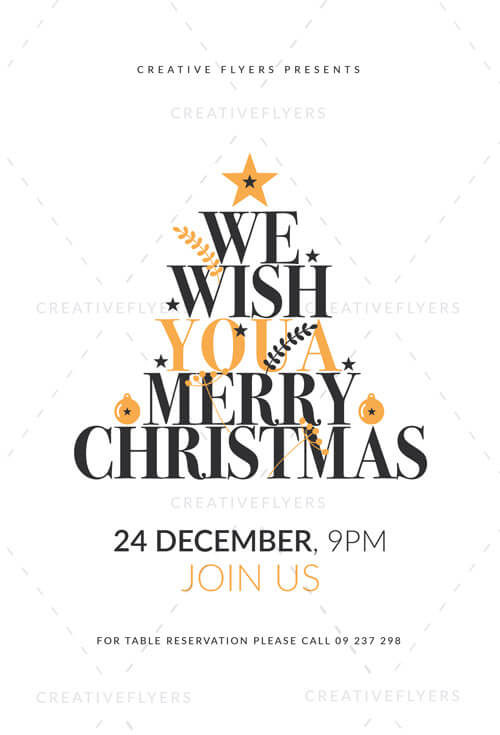 An elegant and minimalist Christmas invitation flyer set against a dark gray/black background. The central design is a clever, stylized Christmas tree formed entirely by the white and gold words: “WE WISH YOU A MERRY CHRISTMAS.” The tree is crowned with a gold star and decorated with small gold ornaments and decorative leaves.