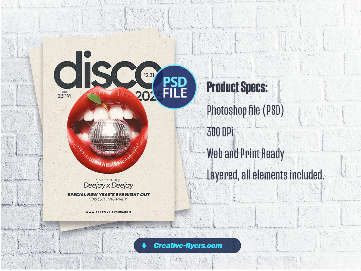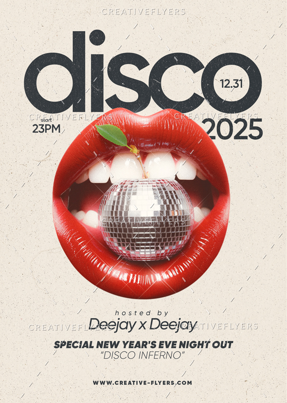 The layout is centered around a large, glossy red lips with a shiny disco ball placed in the mouth, creating a striking visual contrast. The background is a textured off-white, giving a vintage feel. At the top, the word ‘disco’ is prominently displayed in large, black lowercase letters with a clean, sans-serif font. The overall design is minimalist vibrant, suitable for promoting a New Year’s Eve event, disco party, a music events this summer and others…