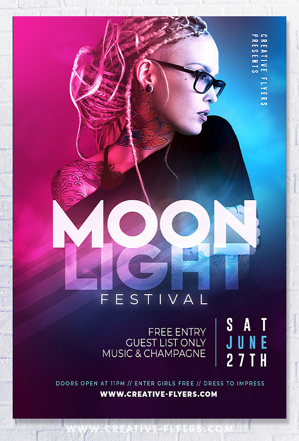 A New music flyer Template with a beautiful gradient of colors on a black background, woman mannequin in a black shirt wearing black framed eyeglasses! If you liked this style, download this Photoshop PSD template to promote your musical festival, party or event.