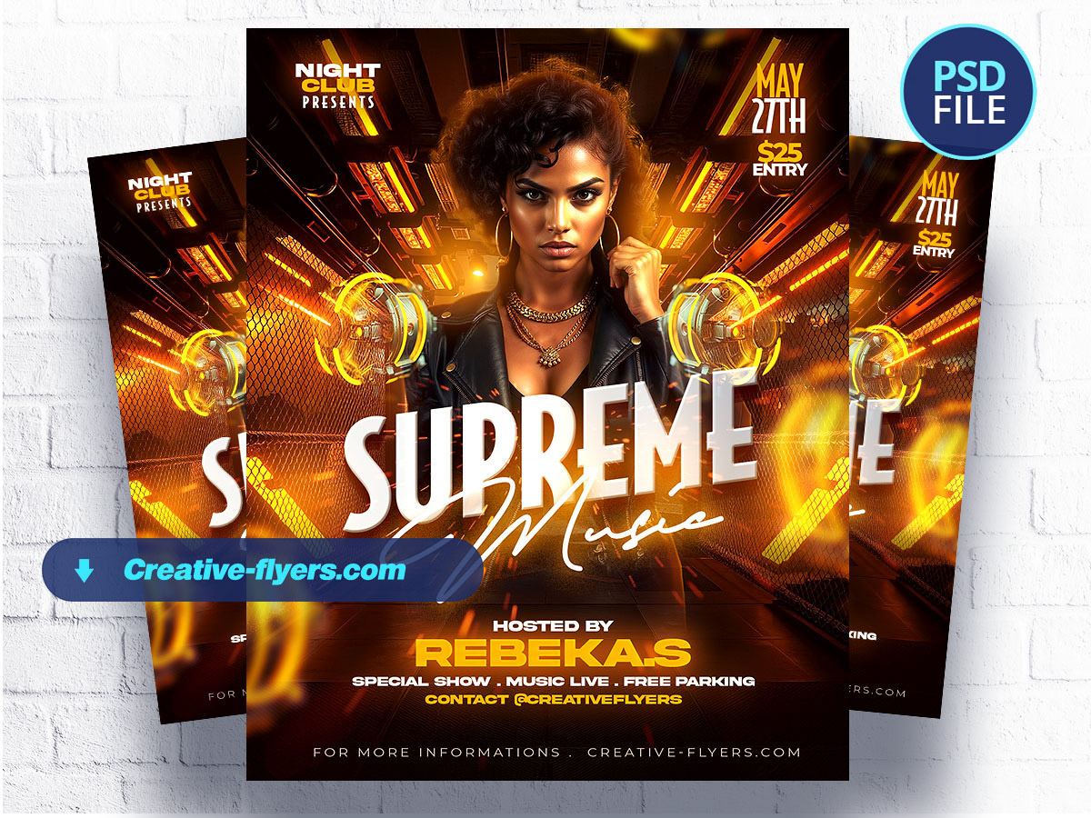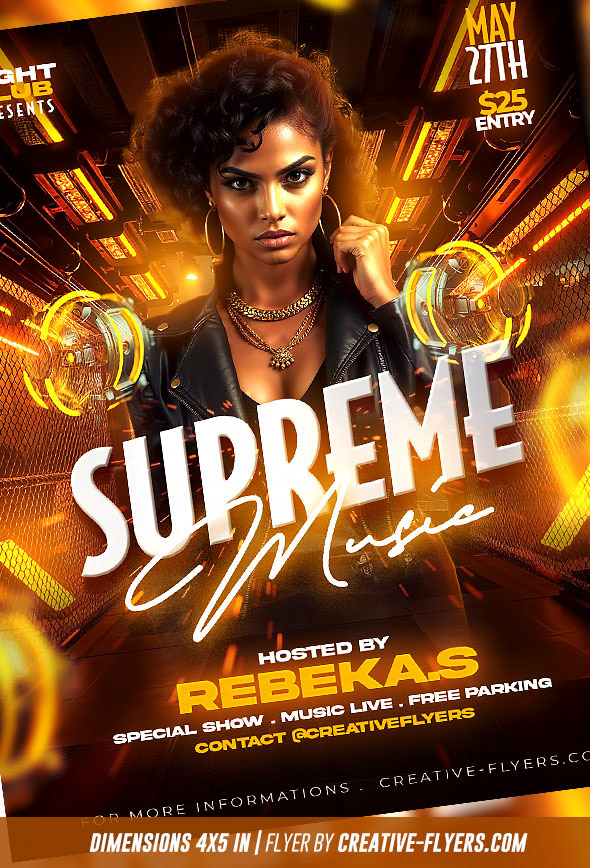This striking Supreme Music flyer features a fierce female figure in a black leather jacket, illuminated by an intense golden glow. Futuristic elements, dynamic lighting, and bold typography create an electrifying atmosphere, perfect for nightclub events, live music shows, and exclusive parties. Designed to captivate audiences, this high-energy flyer is ideal for promoters aiming to make a powerful impact.
