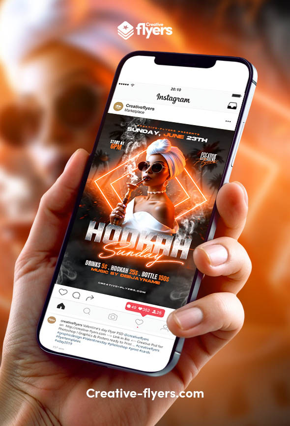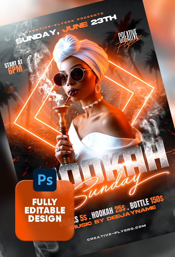 Designed for a Sunday hookah lounge event, this flyer combines elegance and urban cool. The glowing diamond backdrop, smoke textures, and dramatic lighting were added using Photoshop brushes, blending modes, and layer effects. A fashionable woman smoking hookah is central, reinforcing the luxury theme. All elements aim to attract a trendy, upscale crowd.