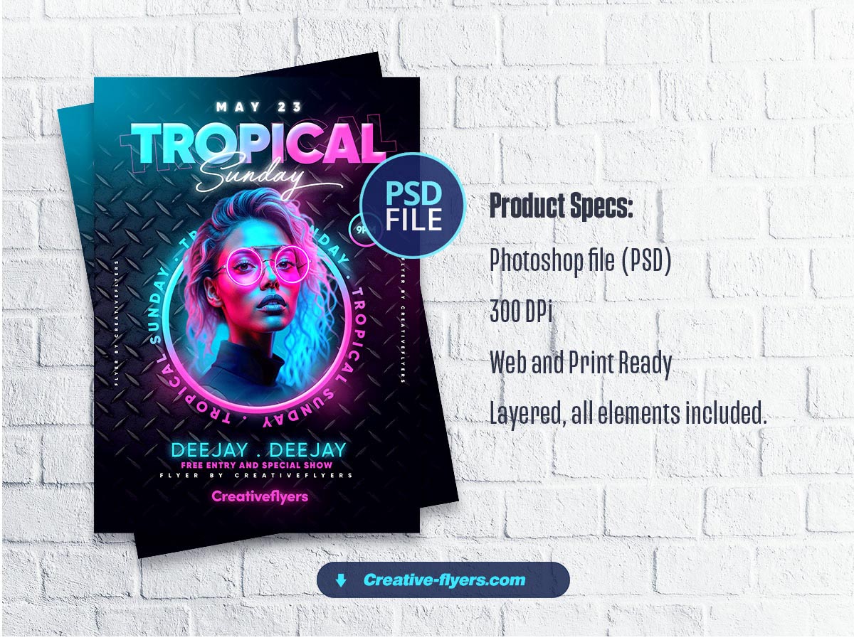 Vibrant and modern promotional flyer featuring a central image of a person, wearing large, round, neon pink glasses. The background is dark, enhancing the neon effect of the text and graphics. The overall design is eye-catching, with a tropical and energetic theme, utilizing neon colors and bold typography to attract attention. Perfecto to promote Nightclub party, neon vibes event, girls party, ladys night, Rnb music events or others…