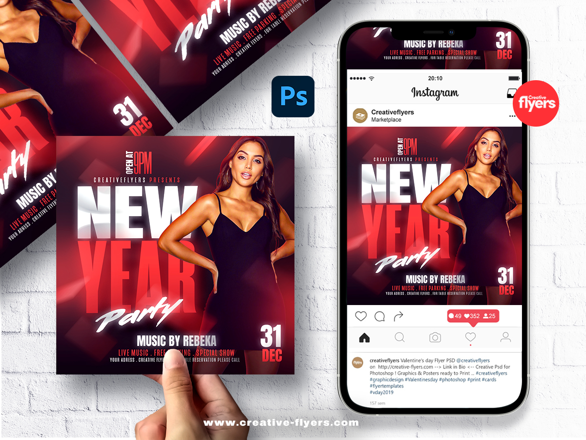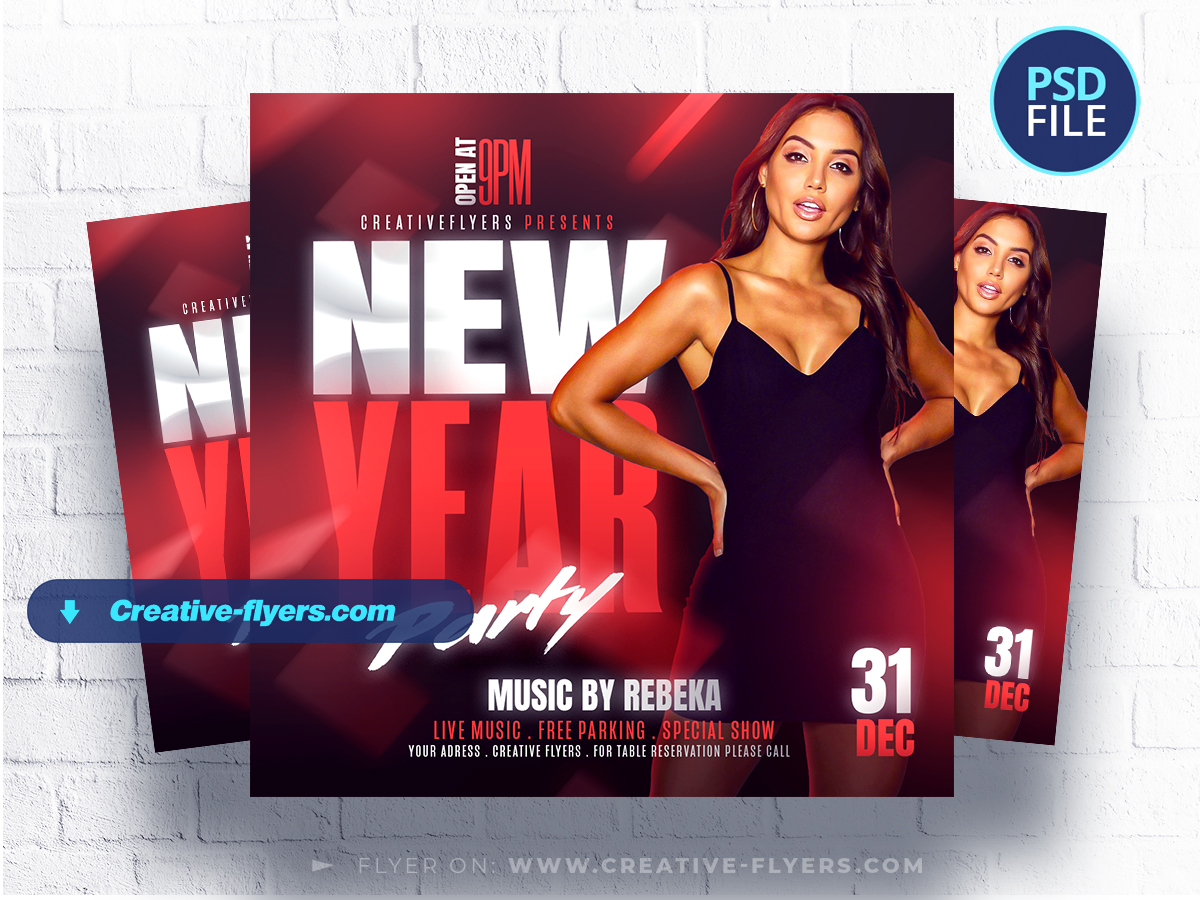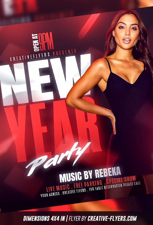 Promotional flyer for a New Year party. The layout is vertical with a bold and modern design. The background features a gradient of red and black tones, creating a festive atmosphere. The central text reads ‘NEW YEAR Party’ in large, bold white and silver letters, with ‘Party’ in a cursive style. On the right side, there is an image of a woman wearing a black dress. Perfect to promote your next nightclub events.