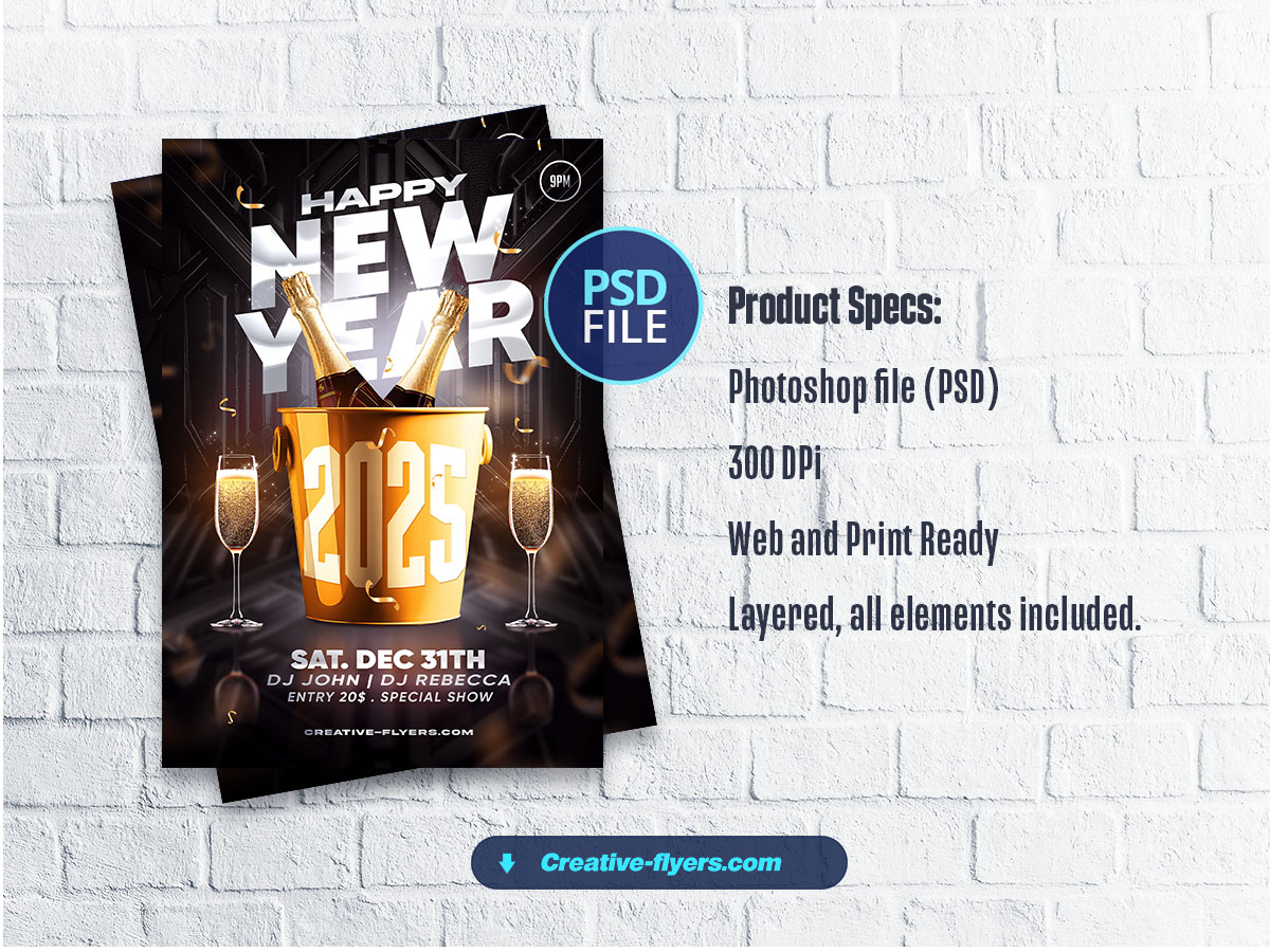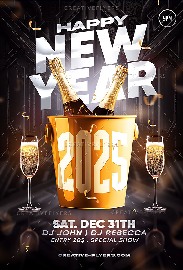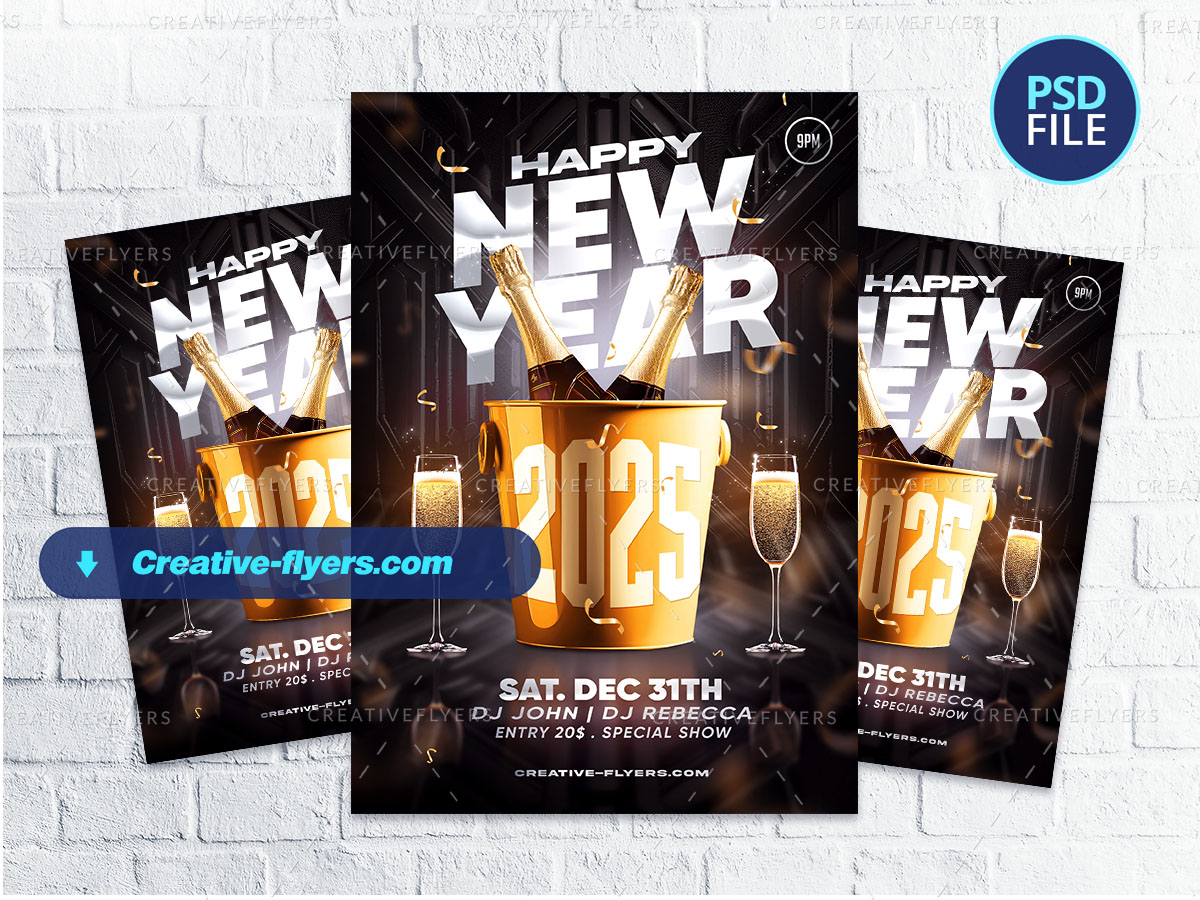 Festive and elegant New Year party flyer with a modern design. The layout features a central golden ice bucket with champagne bottles, the year ‘2025’ prominently displayed in bold, metallic gold numbers on the bucket. Above, large white text reads ‘HAPPY NEW YEAR’ in a bold, sans-serif font. The background is dark with sparkling light effects, enhancing the celebratory theme. The overall color scheme is black, gold, and white, creating an elegant and festive atmosphere.
