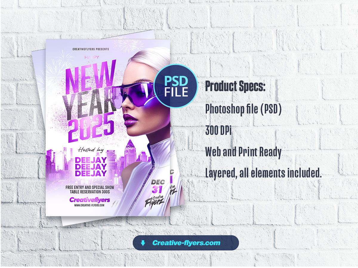 Vibrant and futuristic promotional flyer for a New Year’s Eve event in 2025. The layout is vertical with a dominant purple and white color scheme. The background features a stylized city skyline with fireworks, creating a festive atmosphere. The central subject is a woman, wearing large, reflective purple sunglasses and bright purple lipstick. Perfect invitation to celebrate the new year…