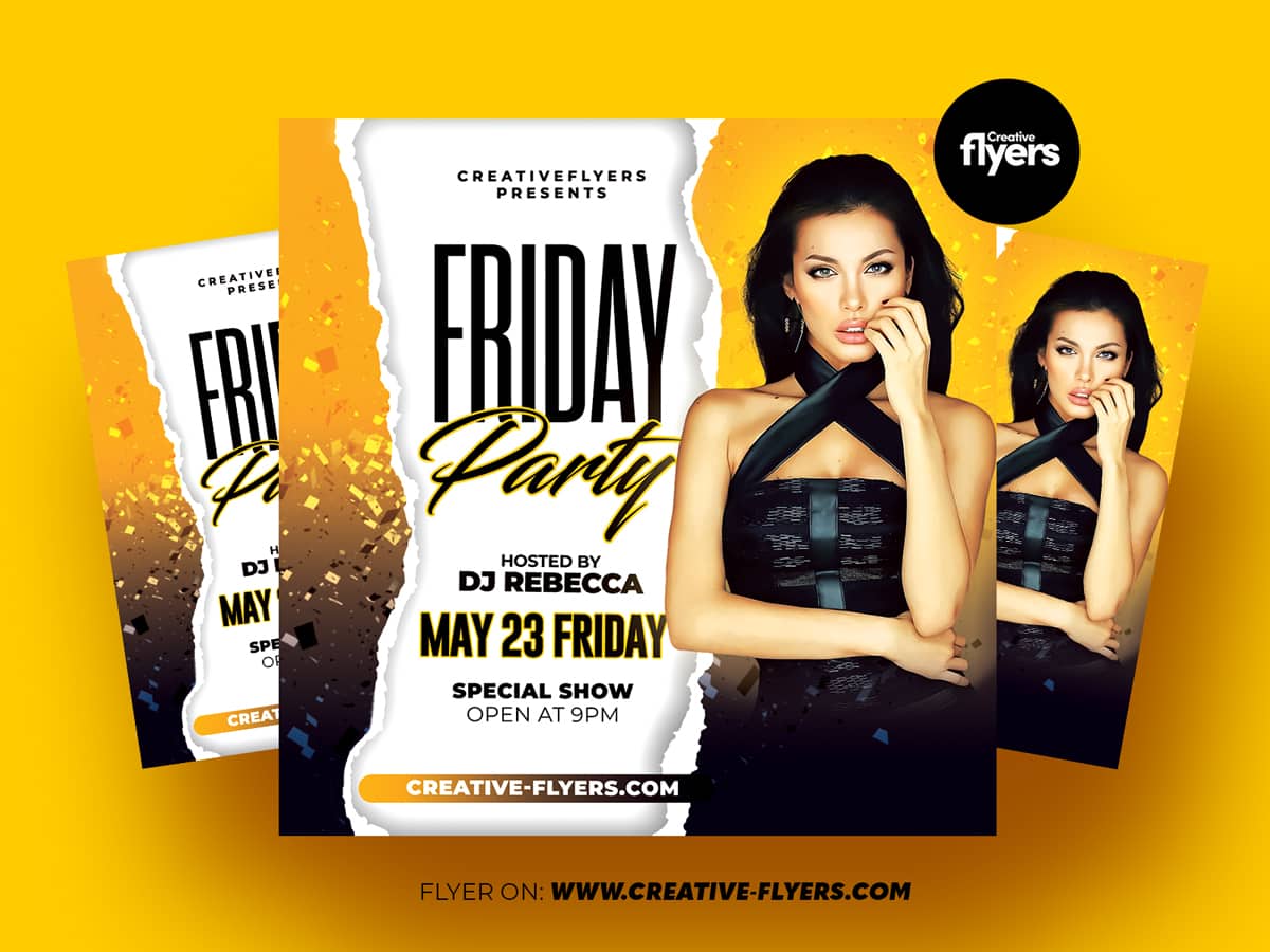 Stunning nightclub template, white and yellow color with torn paper effect in the center, black fonts and female template on the right. A quality design for print and web distribution.