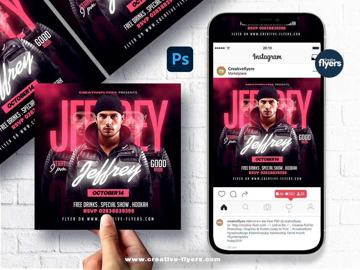 Promotional flyer with a modern and bold design. The layout features a central image of an Artist, Dj… The background is a gradient of dark colors with a large, semi-transparent text in pink, creating a layered effect. The main title is prominently displayed in a white, cursive font across the center. The overall color scheme is black, pink, and white, creating a vibrant and eye-catching design, perfect for Nightclub concerts, dj show, hip hop events or others
