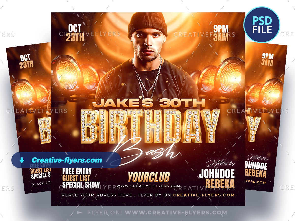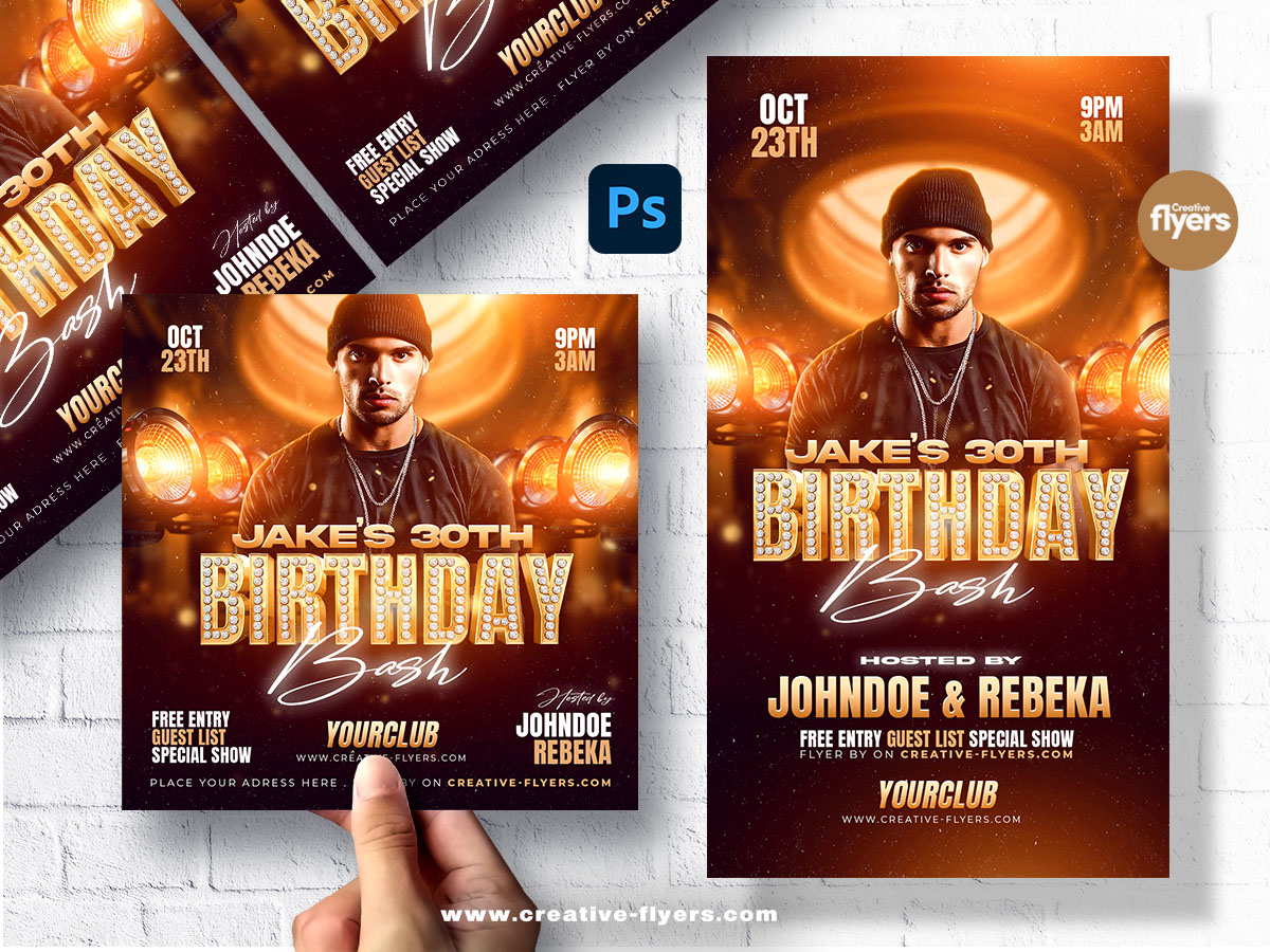 Vibrant and dynamic party flyer with a modern design, perfect to promote birthday party in a Nightclub. The layout features a central image of a man, wearing a black beanie and a dark t-shirt. The background is a mix of dark and golden hues, with bright, circular light effects on either side of the subject, creating a festive atmosphere. The word ‘BIRTHDAY’ is styled with a marquee light effect, adding a celebratory feel. The flyer dimensions ‘4X4 IN’ and 1080×1920 (Story format).