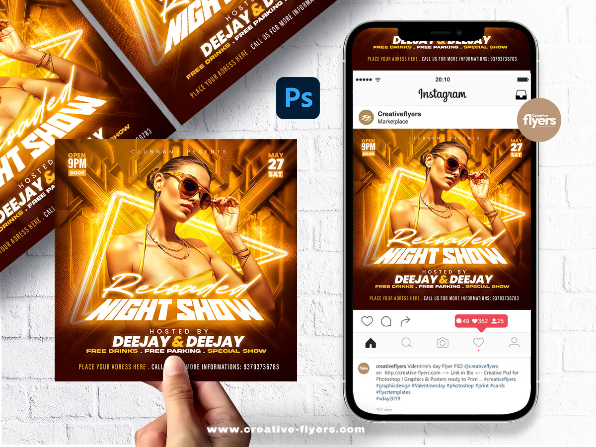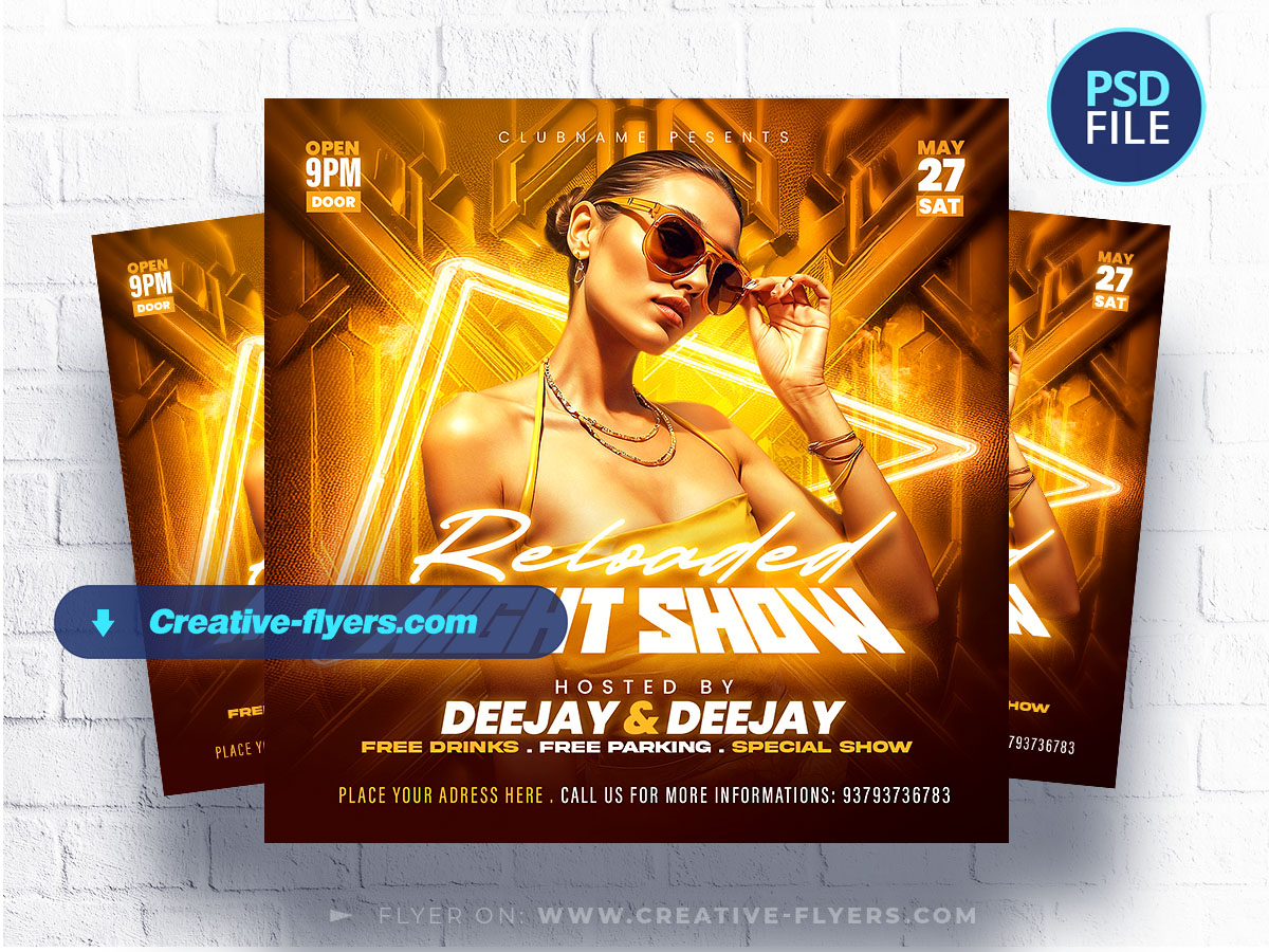 Promotional flyer with a modern, vibrant design for Nightclub Party. The layout features a central image of a woman. She is set against a dynamic background with glowing geometric shapes. The text is bold and eye-catching, with ‘Reloaded Night Show’ in large, white, cursive font across the center. The overall color scheme is warm, with shades of orange, gold, and white, creating an energetic and inviting atmosphere. The flyer dimensions are as 4×4 inches, and it is designed by Creative-Flyers.com.