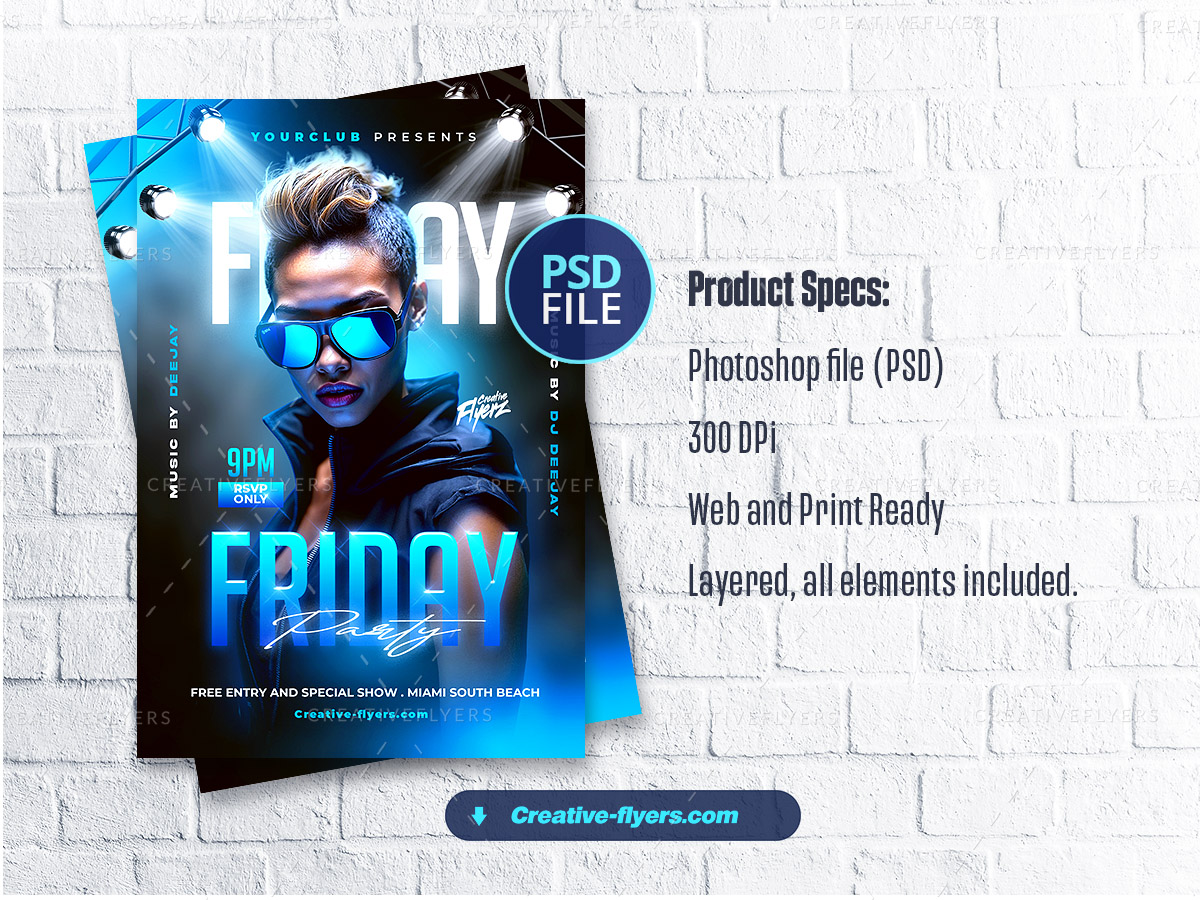 This flyer was designed to capture the electrifying energy of a Friday night party. The neon blue tones, bold typography, and dramatic lighting effects create a futuristic and edgy look. The confident model in reflective sunglasses enhances the modern club atmosphere. Strong contrasts, sleek gradients, and sharp design elements make this flyer an eye-catching promotional piece for an unforgettable night out… Perfect to promote nightclub party…