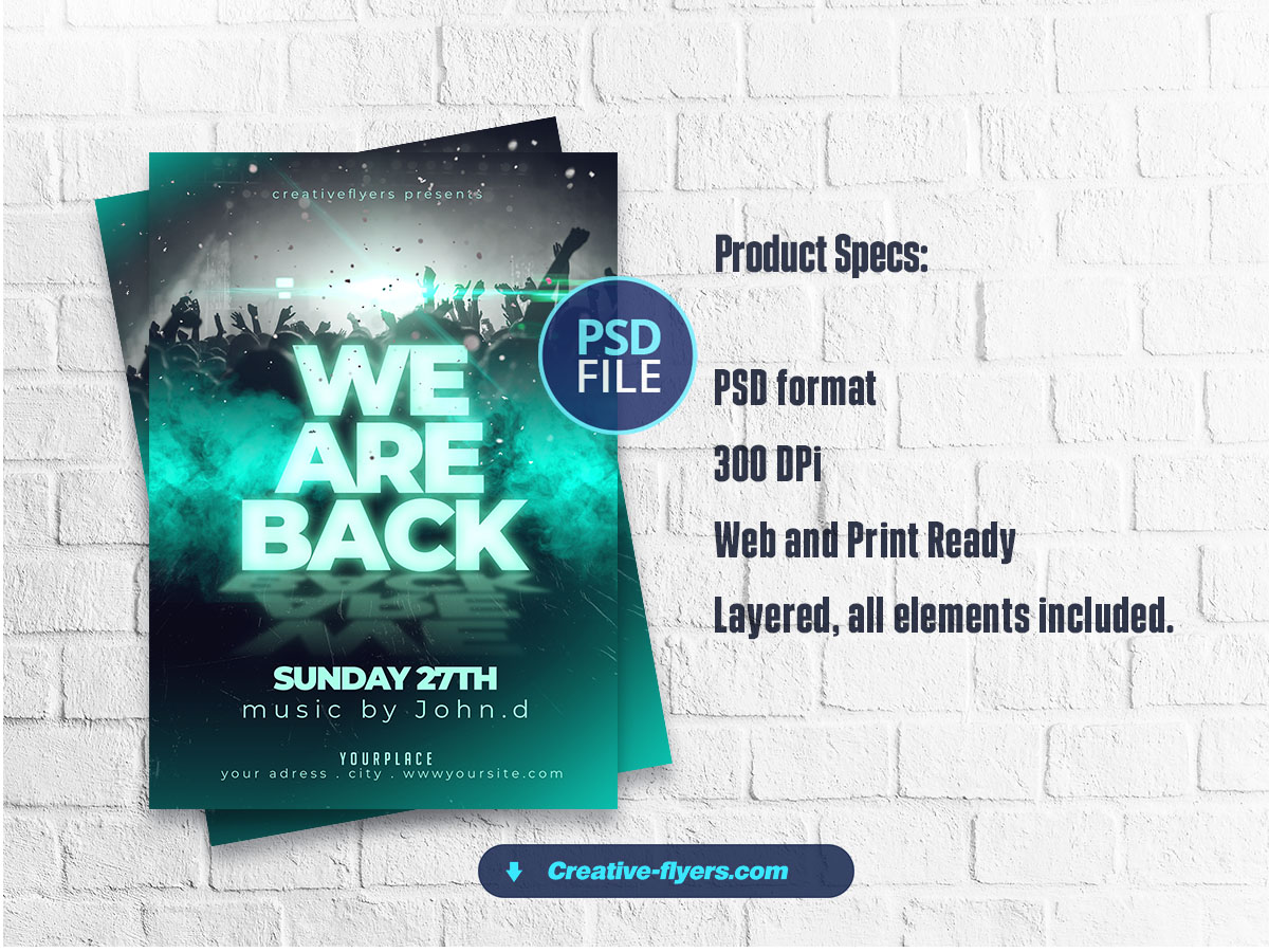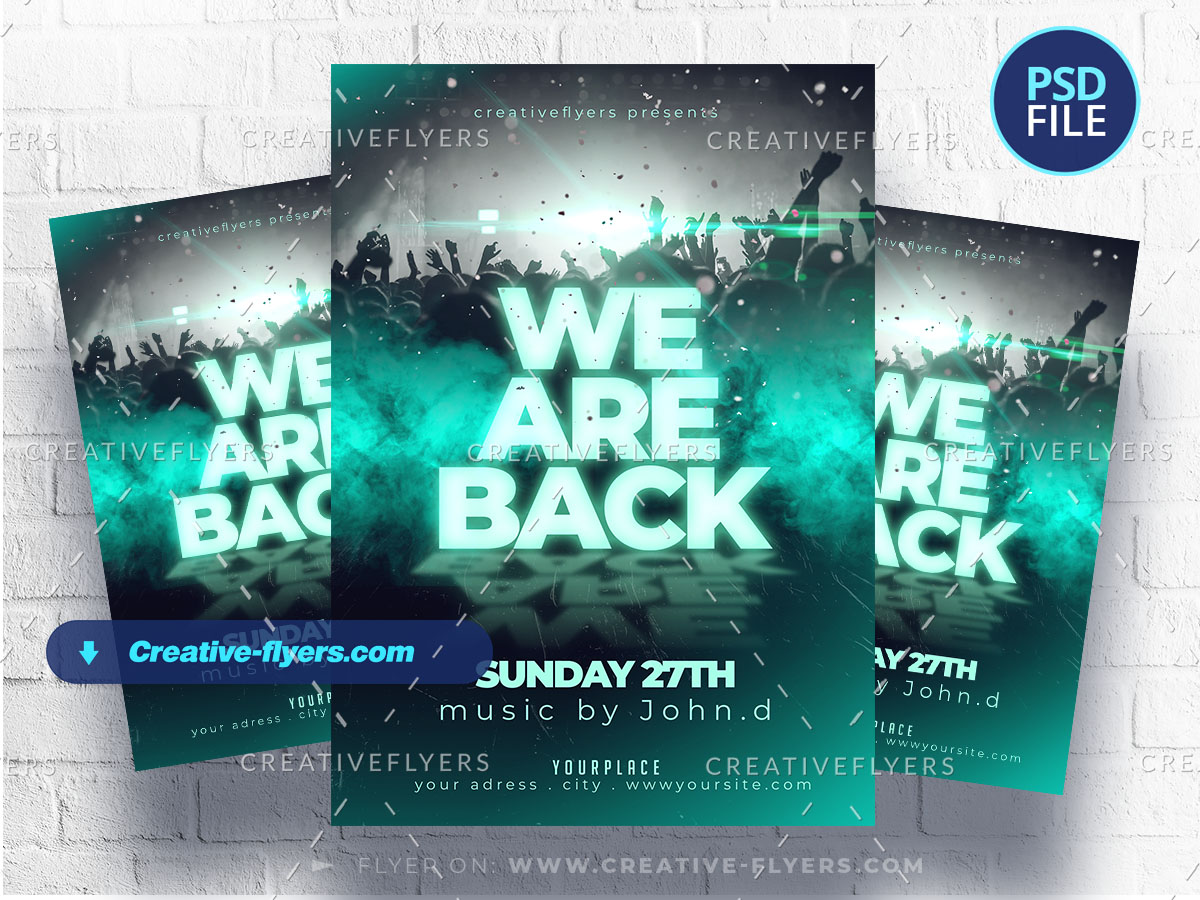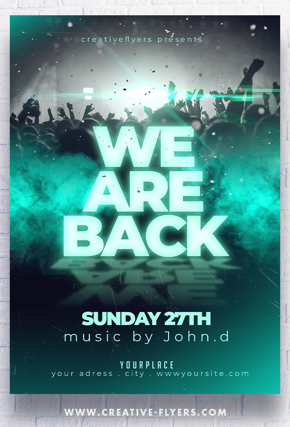 This flyer design captures the excitement of a party comeback with a bold, glowing โWe Are Backโ headline, dynamic crowd imagery, and vibrant green smoke effects. The layout emphasizes the event date and DJ name while using a modern font for easy readability. The high-contrast design creates a sense of anticipation, perfect for a nightclub or concert promotion.