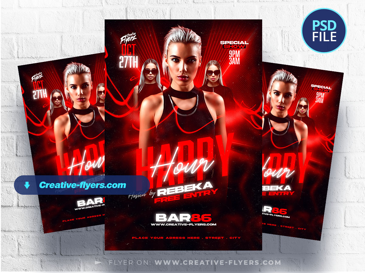 Digital event flyer with a modern and vibrant design. The layout features a central image of a woman. She is positioned against a dark background with red neon light effects. The text is bold and prominent, with ‘Happy Hour’ in large red letters across the center. The overall color scheme is dominated by red, black, and white, creating a striking and energetic visual appeal. Perfect to announce Nightclub event, dj party, girls party, RnB ant hip hop music events or others…