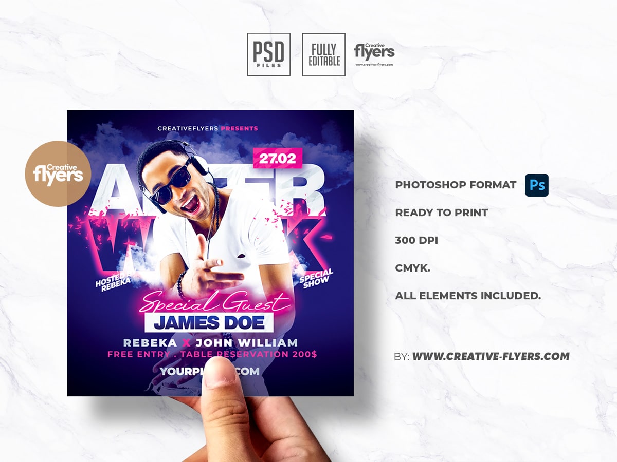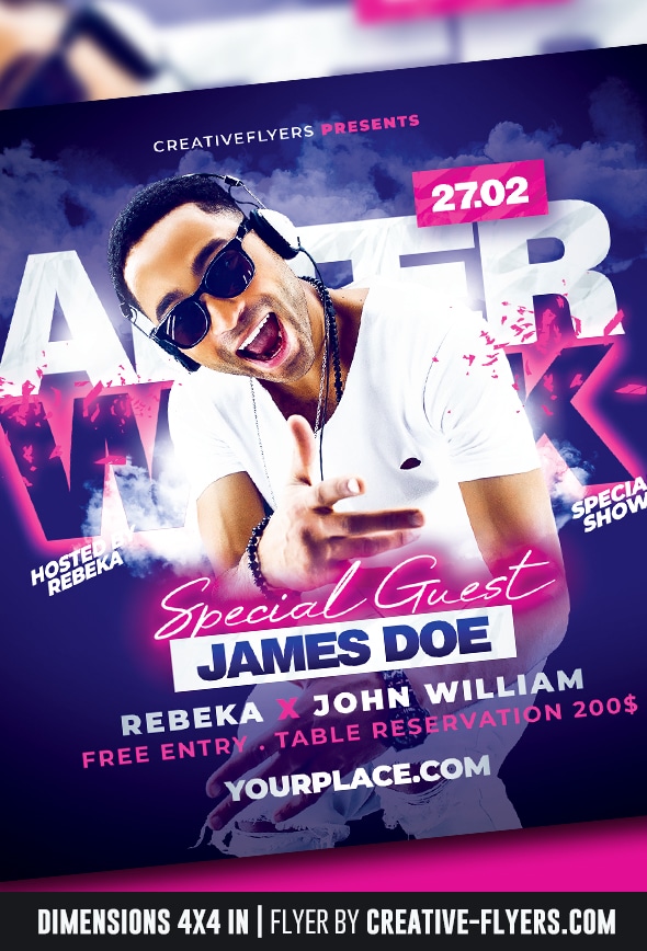 A blue and pink nightclub event party flyer template. You can easily change all texts and colors and all elements are included in the download – increased your creativity with our pre-designed photoshop flyers…