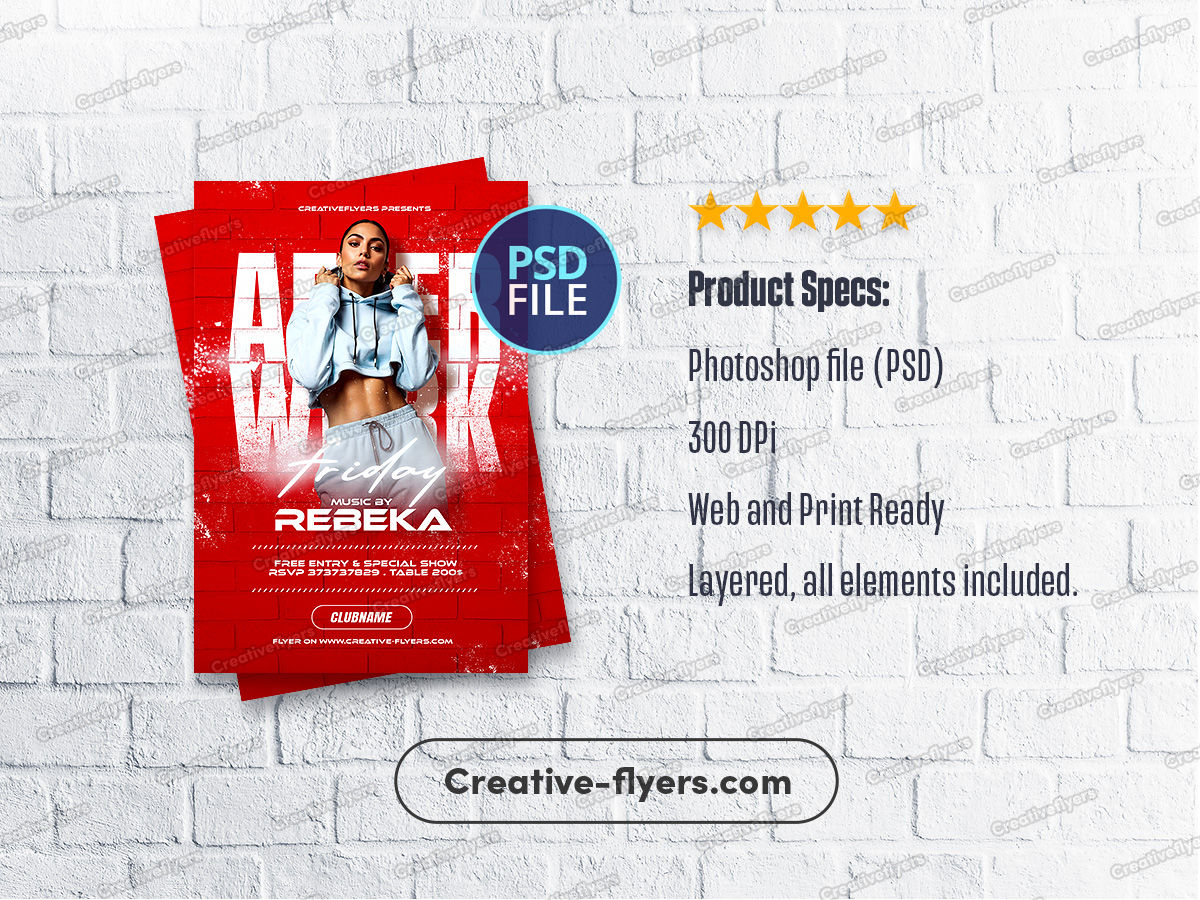 This flyer blends an urban, edgy vibe with bold red backgrounds and gritty textures, featuring a confident, street-style model to grab attention. The large white “AFTER WORK” text makes the event unmistakable, while handwritten and modern sans-serif fonts add contrast. This style targets young professionals seeking a post-work escape with music, drinks, and great vibes.