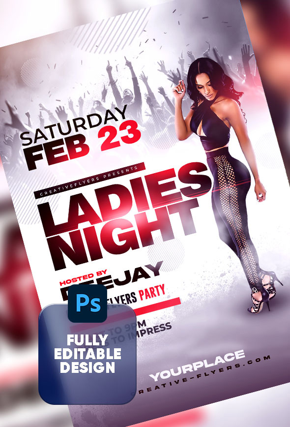 The flyer design aims for a chic and exciting vibe for a “Ladies Night” party. The central figure of a stylish woman in a dynamic pose immediately grabs attention. The contrasting red “LADIES NIGHT” text against the smoky background creates visual impact. Details like the date, host, and dress code are presented cleanly. The blurred crowd suggests a lively atmosphere, making it an appealing invitation to a glamorous Saturday night event.