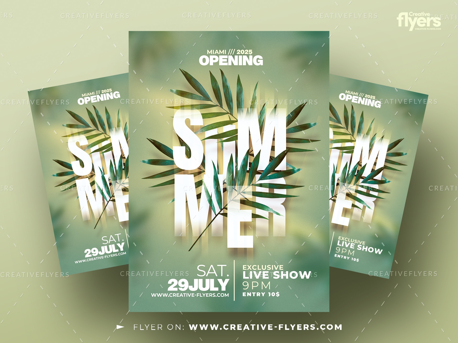 Discover this design for this summer, which will be a great announcement for your events and your evenings with a quality graphic creation. it is an A5 flyer, with the theme of the event in its center to directly attract attention. There are palm leaves in the background and overlapping the white letters. A minimalist graphic graphic style that will appeal to many people.