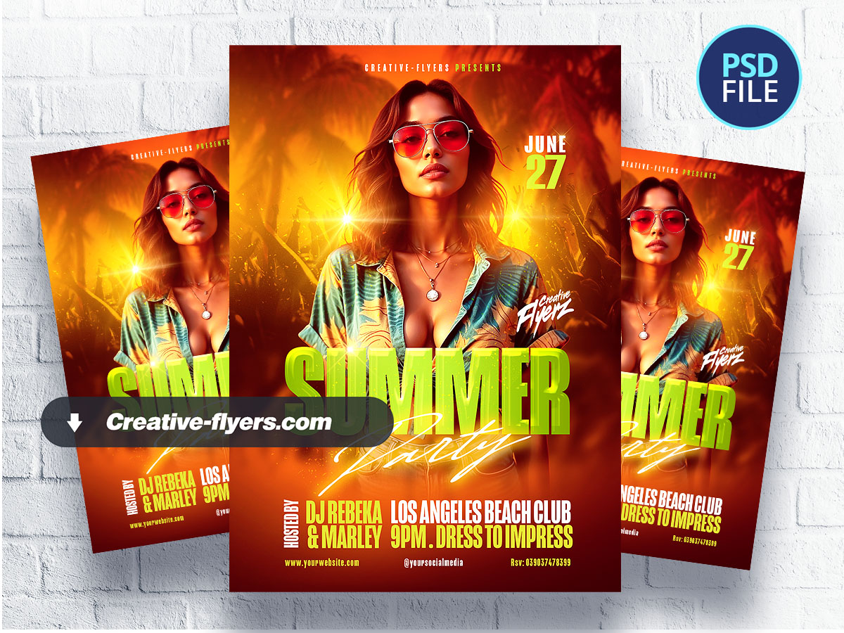 Stylish promotional flyer for a summer party. The layout features a central figure of a woman, wearing red-tinted sunglasses and a tropical-themed shirt. The background is a warm, glowing sunset, enhancing the summer theme. Bold, bright green text at the bottom reads ‘SUMMER PARTY’ in a large, eye-catching font. The design is dynamic and colorful, with a modern and festive aesthetic, aimed at attracting attention to the summer event, beach party, spring break, musci festival or others…