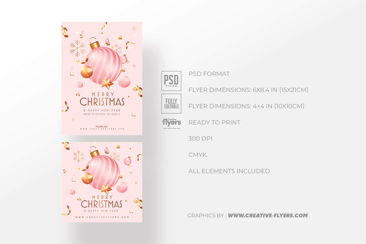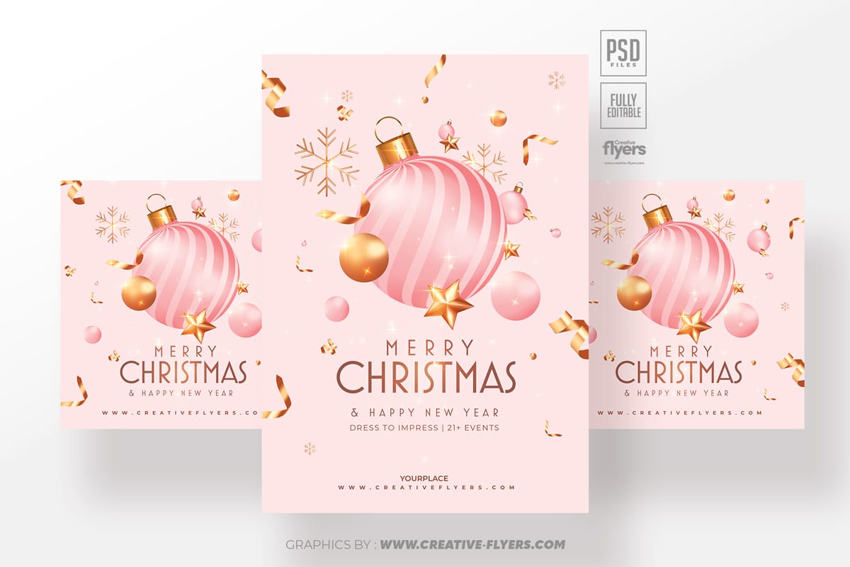 Chic pink and gold Photoshop flyer template in PSD format, created to announce your upcoming Christmas and New Years party, a classy and minimalist top notch design that will make the difference