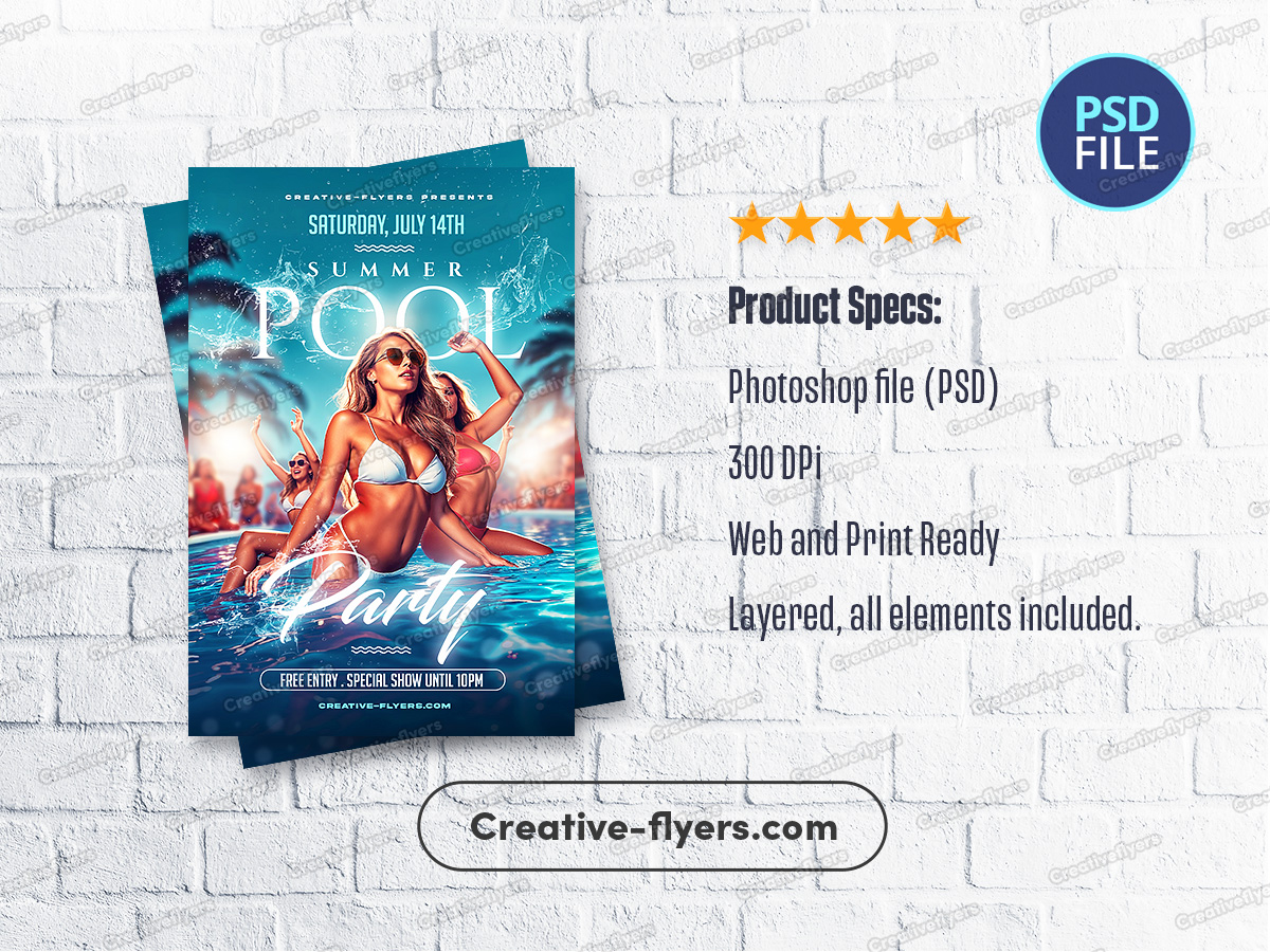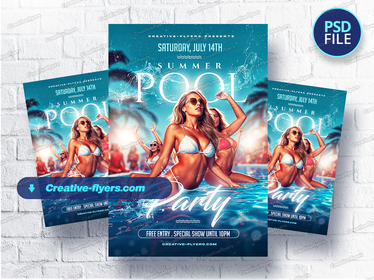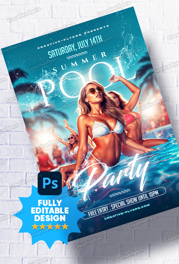 The flyer captures a vibrant pool party scene using high-saturation tones, enhanced water splashes, and lively characters. The design blends tropical backgrounds, energetic lighting, and stylish fonts to create a festive summer mood. Photoshop effects like lens flares, water brush overlays, and sunburst gradients give the artwork a sense of motion, heat, and excitement.