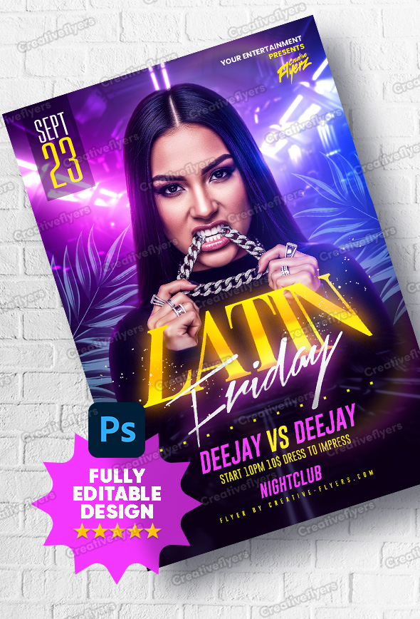 This flyer was designed to promote an intense and energetic Latin Friday night. Featuring a bold woman biting a chain, vivid neon lights, and tropical elements, it embodies strength, heat, and rhythm. The design blends urban energy with vibrant color schemes to attract club-goers and highlight a Deejay vs Deejay showdown.