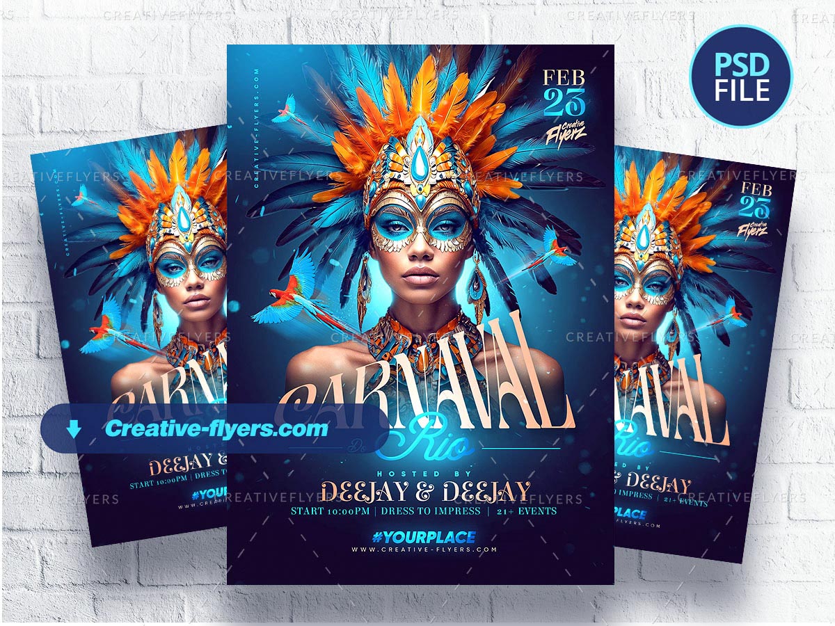 Colorful promotional flyer for a carnival event (Mardi Gras). The layout is vertical, featuring a central figure, adorned in an elaborate headdress made of orange and blue feathers. Surrounding the figure are small, vivid blue and orange Parrots, adding to the festive theme. The text ‘CARNAVAL’ is prominently displayed in large, ornate white and blue lettering across the center.