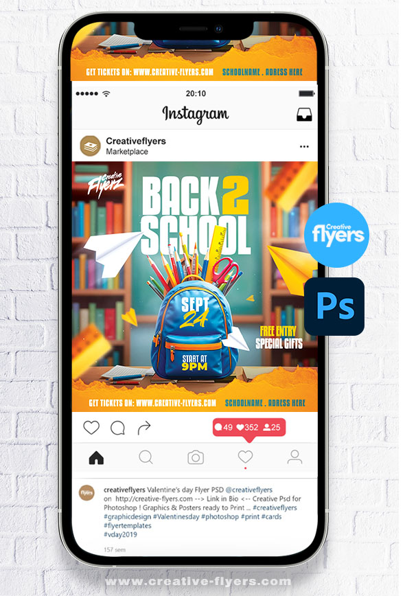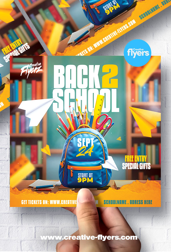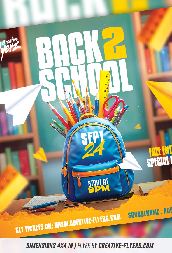 Promotional poster for a ‘Back 2 School’ event. The layout features a central image of a blue and yellow backpack filled with school supplies such as pencils, rulers, and scissors. The background includes bookshelves on either side, creating a classroom-like atmosphere. The overall design uses a combination of vibrant colors and school-related imagery to convey the theme. Perfect to promote your next School and college party…