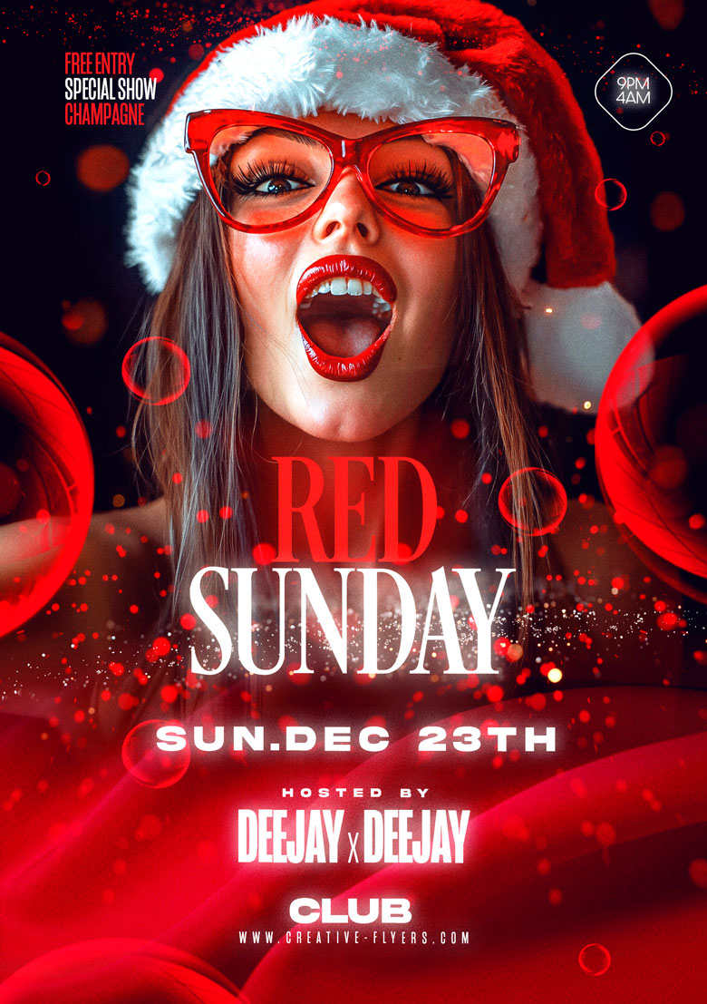 This Red Sunday flyer, we used a bold red palette combined with festive particle effects. The modelโs presence adds intensity and charisma, reinforcing the nightlife mood. A clean structure organizes key event details with readability in mind. Designed to captivate instantly, this flyer delivers a modern, seductive aesthetic tailored for premium party promotions and themed nights.