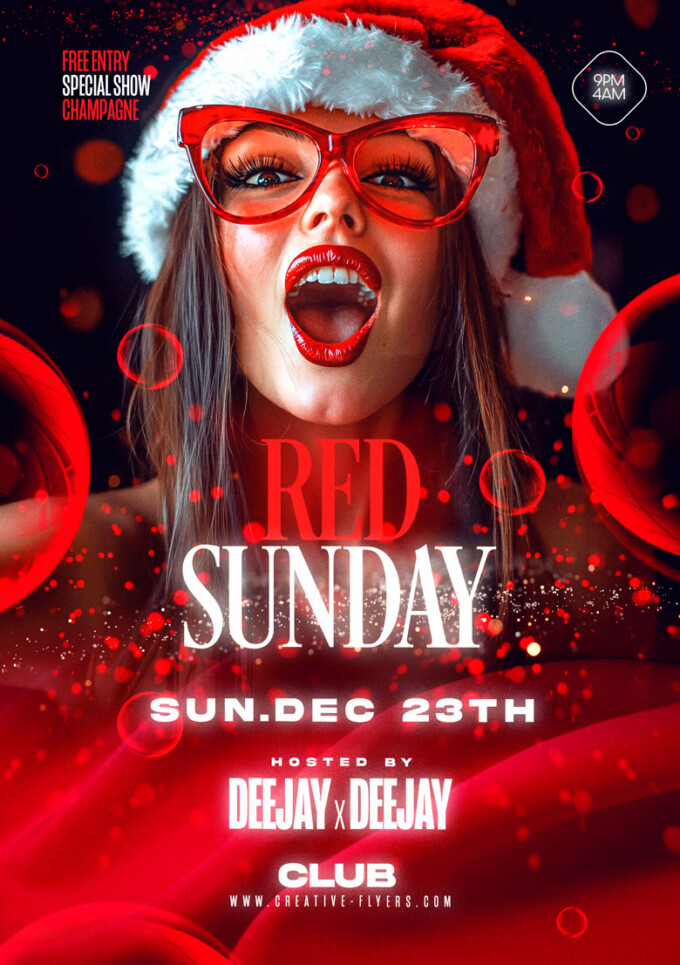 This Red Sunday flyer, we used a bold red palette combined with festive particle effects. The modelโs presence adds intensity and charisma, reinforcing the nightlife mood. A clean structure organizes key event details with readability in mind. Designed to captivate instantly, this flyer delivers a modern, seductive aesthetic tailored for premium party promotions and themed nights.