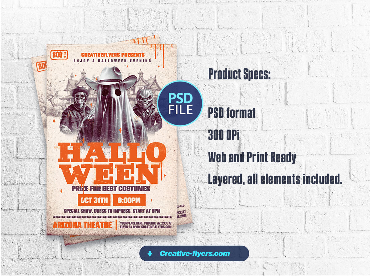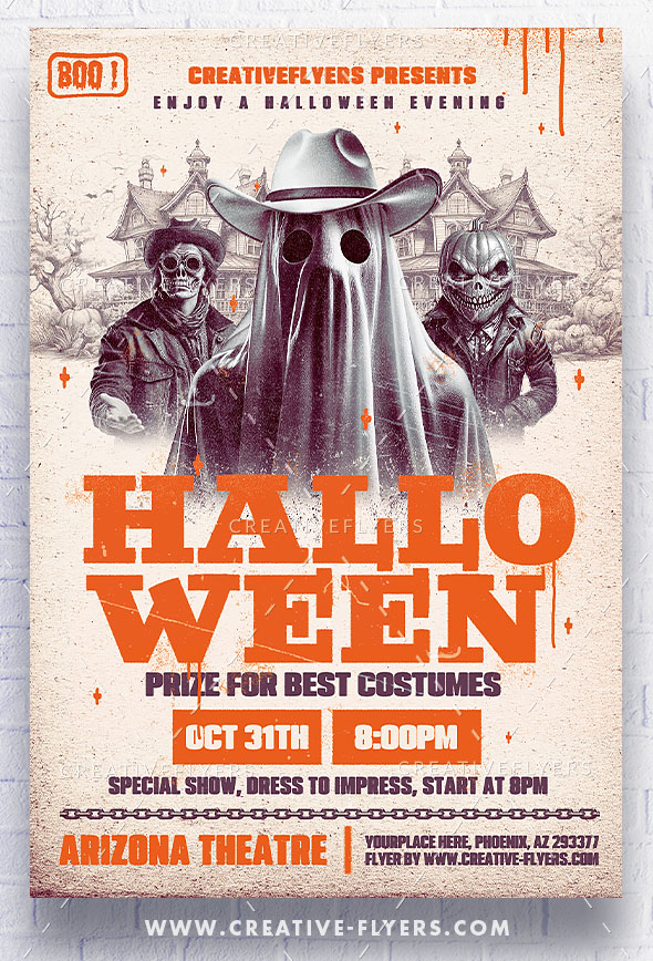 Halloween-themed event poster with a vintage horror style. Featuring three figures in the center dressed in spooky costumes. The central figure wears a ghostly sheet with eye holes, flanked by two figures in skeleton and pumpkin head costumes. The background is a textured, aged paper look with subtle blood splatters. The main title ‘HALLOWEEN’ is prominently displayed in large, bold, orange letters with a distressed texture…