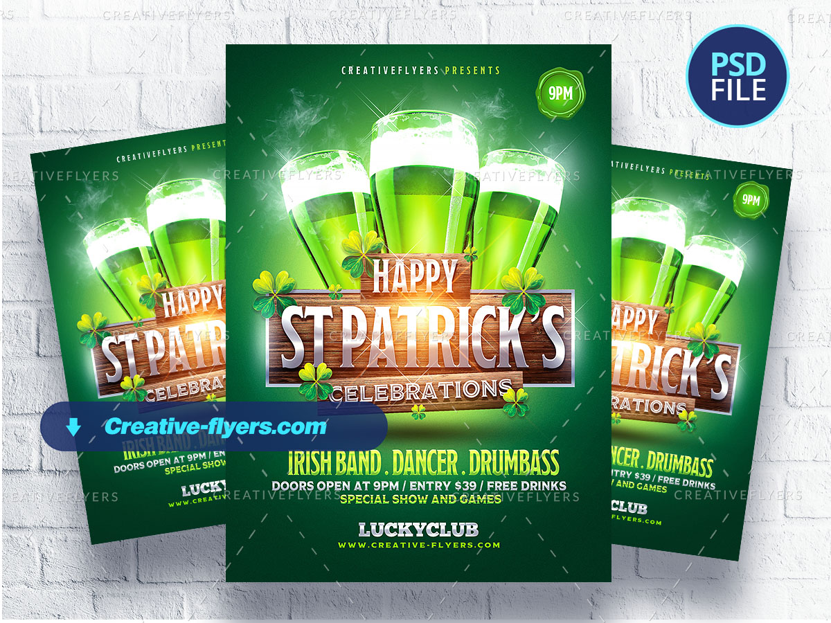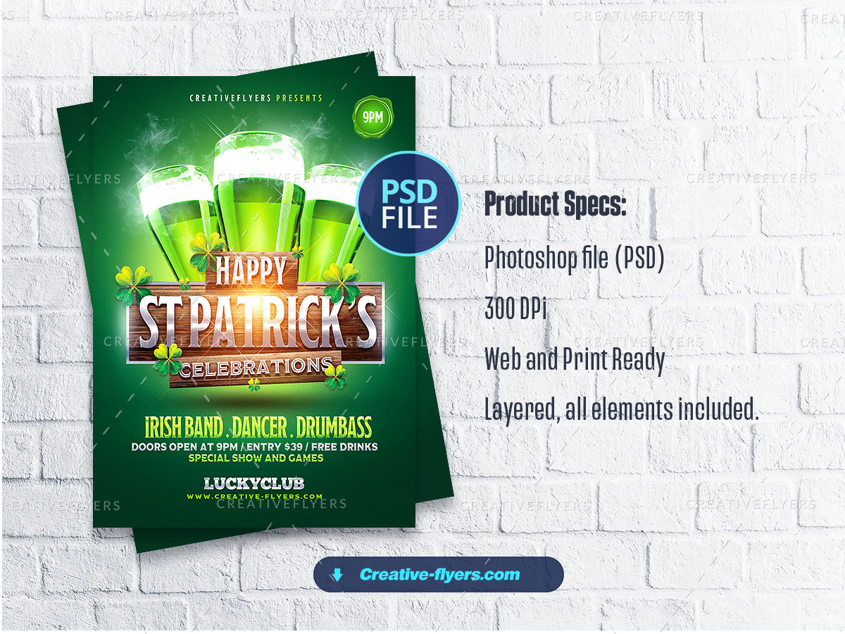 Superb flyer template for our favorite Irish party, a Graphic composed of Saint Patrick’s Day element, beer, clover, wooden texture, green background, beautiful photoshop effect… A perfect visual to announce your event.
