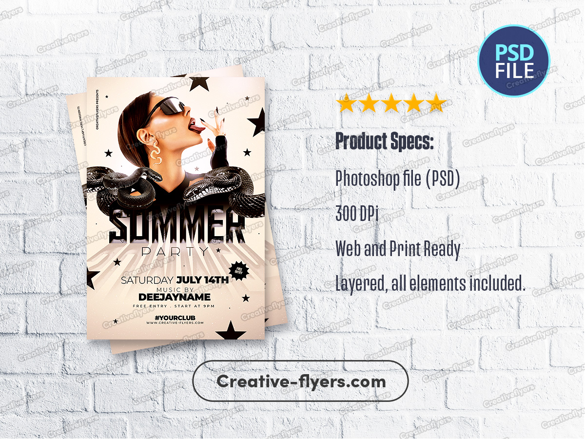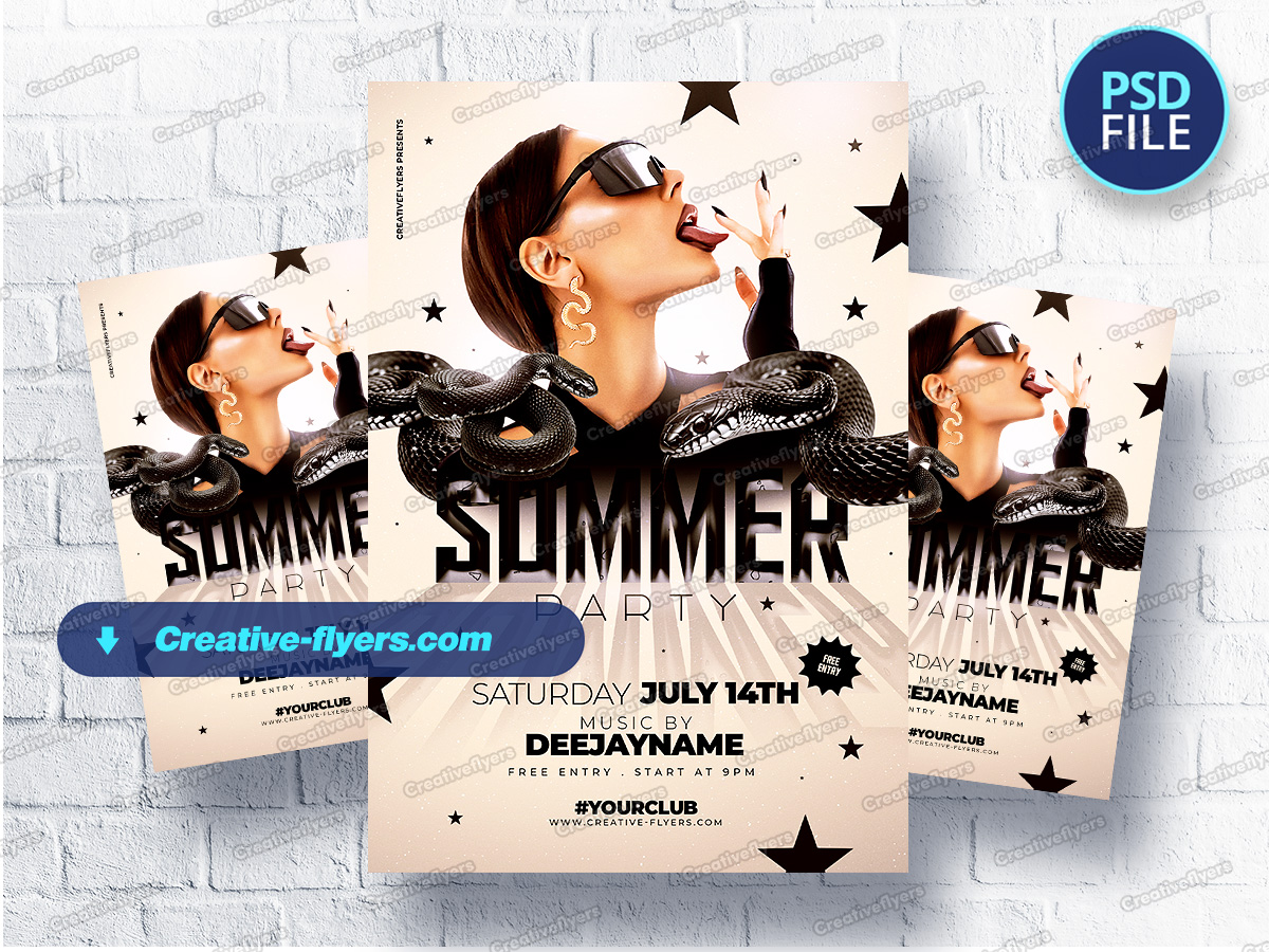This flyer merges fierce fashion with edgy nightlife aesthetics. The dramatic pose, black snakes, and high-contrast shadows evoke mystery and seduction. Ideal for upscale summer events, it draws attention with glam and bold symbolism. The typeface is elegant yet modern, complementing the luxurious and provocative tone.