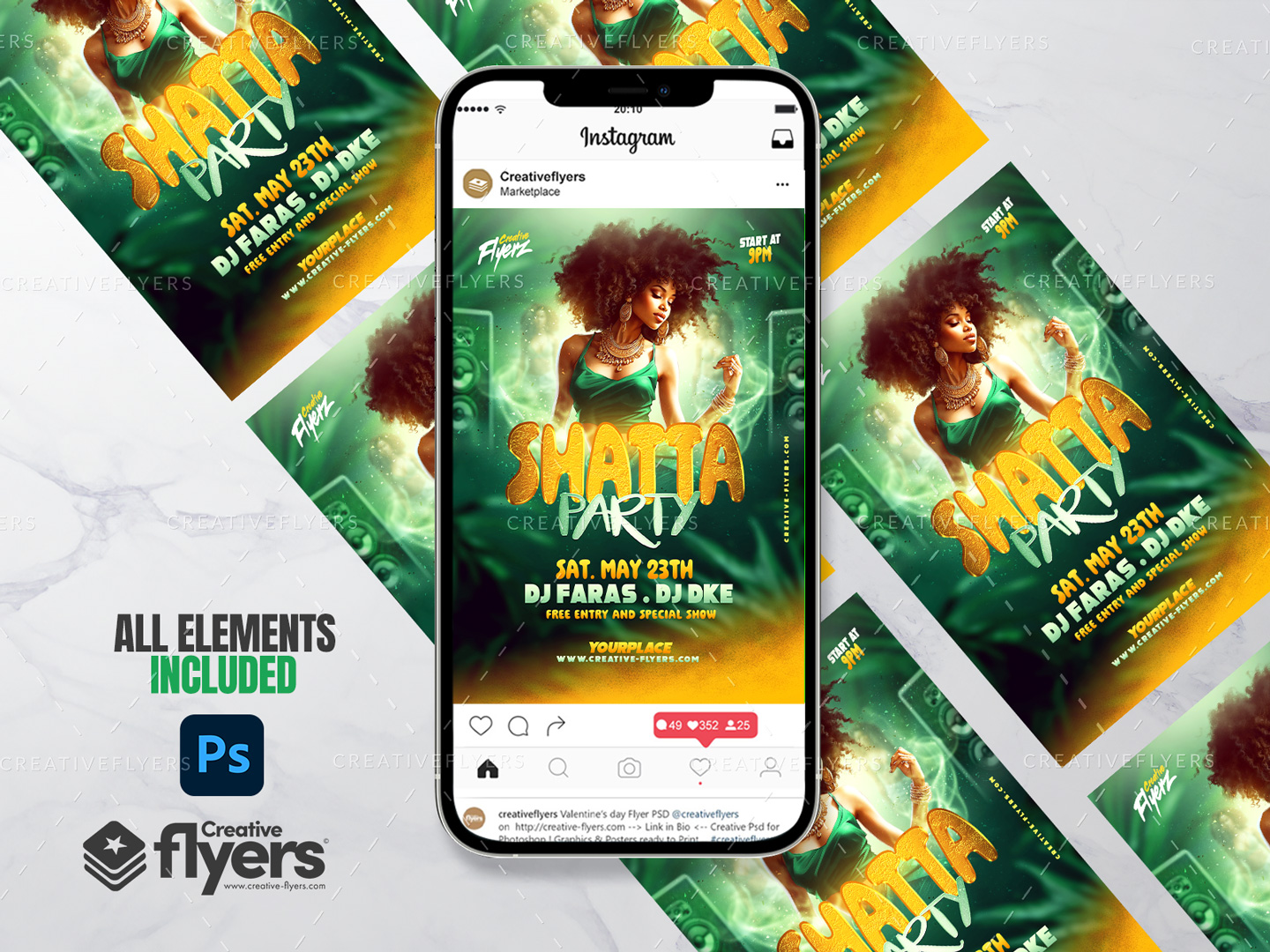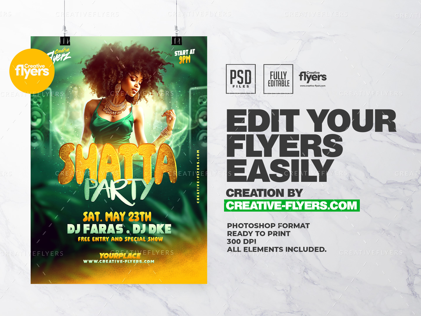 The event is called “SHATTA PARTY” The flyer design is green and golden yellow, with a woman in the center and green light effects in the background for a festive atmosphere, perfect for a summer evening, on the beach in bar, a dancehall evening, Afrobeats events, afro music or other. The title “SHATTA PARTY” is highlighted in gold letters. Date and time information as well as DJ names are clearly indicated, all text is easily editable with the text tool in Photoshop.