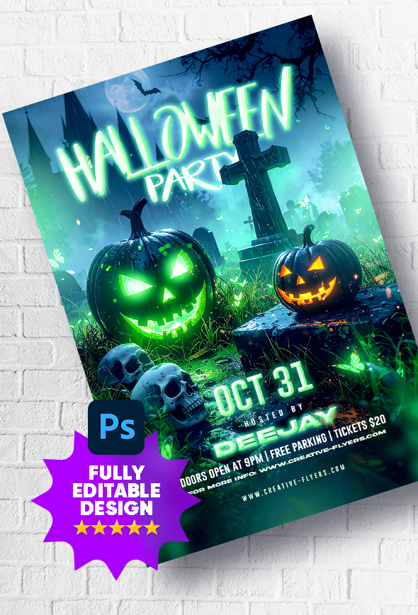Designed for maximum visual impact, this flyer uses glowing pumpkins, skulls, and a misty graveyard background to immerse viewers in a Halloween scene. The neon title ensures modernity, while the eerie imagery creates suspense. Event details are well-placed for readability, combining creativity and clarity. This flyer is both an invitation and a mood-setter for spooky celebrations.