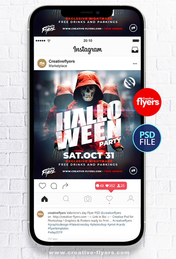 Promotional poster for a Halloween party featuring a central character dressed in a red hooded cape with a skull mask, creating a spooky atmosphere. The background is dark with blurry lights, reinforcing the eerie ambiance. The text “HALLOWEEN PARTY” is prominently displayed in large, bold white letters with a distressed texture.