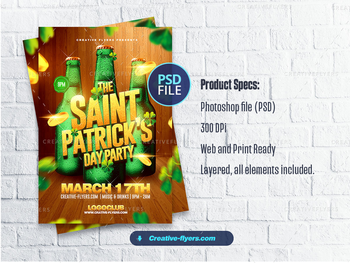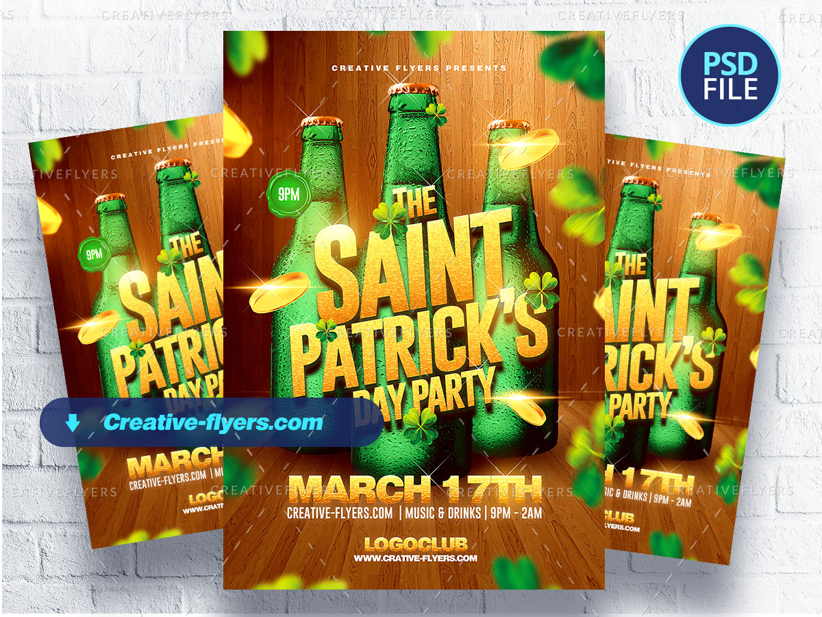 St Patrick’s Day Flyer psd ready to print to celebrate St. Patrick’s Day, Ireland Day and National Day of the Clover Country. This colorful St. Patrick’s Day flyer features three vibrant green beer bottles as the centerpiece, decorated with clovers and glowing gold coins. The bold, golden text “Saint Patrick’s Day Party” pops against the lively background. Event details, are clearly presented, highlighting an evening filled with music and drinks.