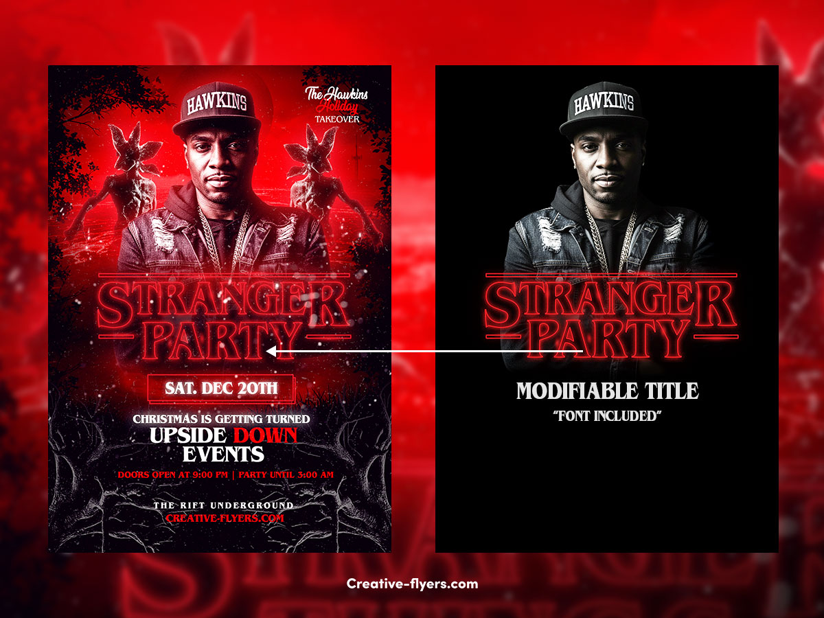 Inspired by the iconic Stranger Things aesthetic, this flyer merges supernatural horror with holiday energy.This concept plays on the contrast between cheerful holiday traditions and the dark, 80s synth-wave aesthetic of the show.
