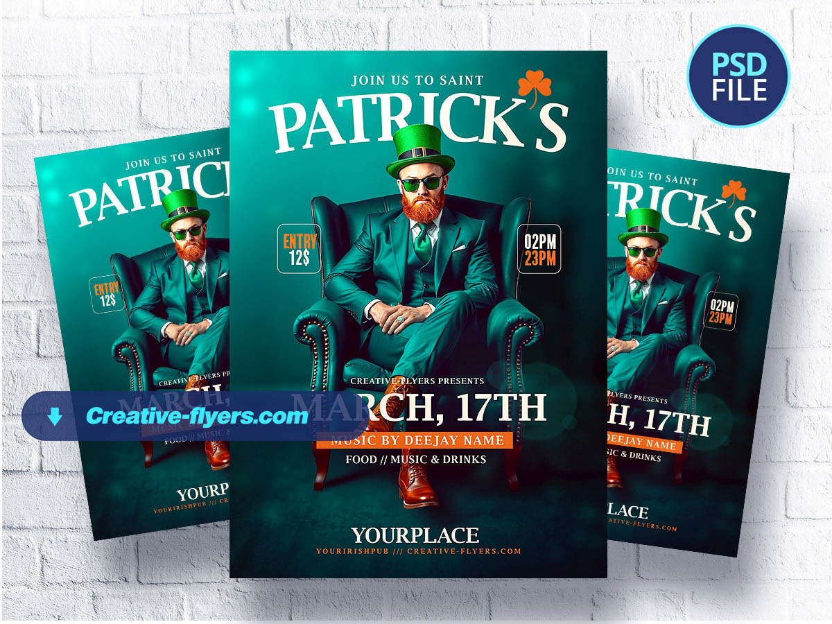 Designed for a premium St. Patrick’s Day event, this flyer combines sophistication with Irish tradition. The central figure—a bearded man in a tailored green suit—adds a charismatic presence. The elegant leather armchair and deep emerald tones enhance the flyer’s upscale aesthetic. The bold yet refined typography ensures visibility, while subtle lighting effects contribute to the festive yet exclusive atmosphere.