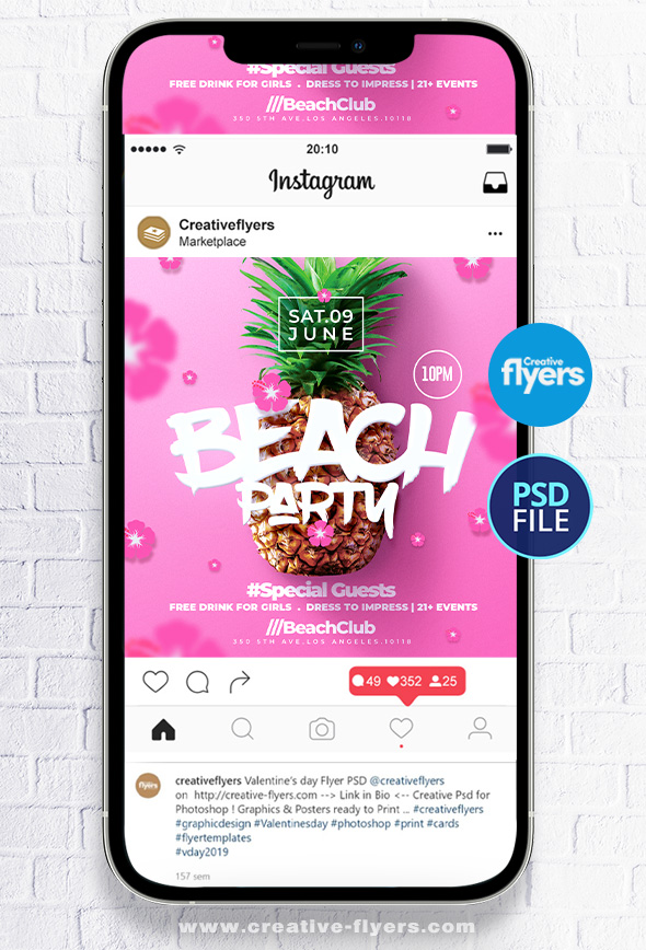 Vibrant and colorful flyer for a “Beach Party” event. The layout features a large central image of a pineapple, adorned with pink flowers. The text “BEACH PARTY” is prominently displayed in bold, white, graffiti-style font on the pineapple. Above the pineapple, a green rectangular box with white text indicates the date. The background is bright pink with small scattered white and pink flowers. Graphic flyer perfect for an evening on the beach, a pool party, chillout party in a bar…
