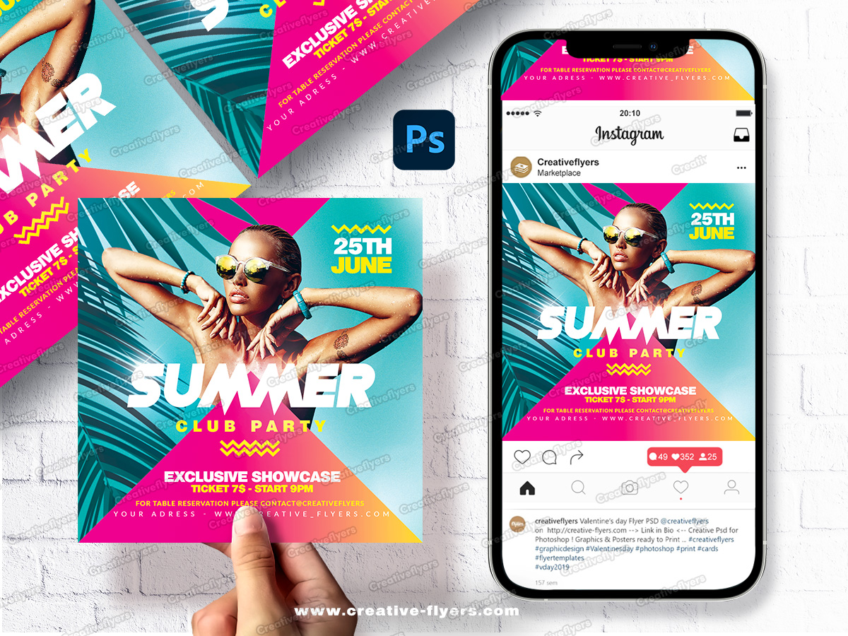 This flyer was created using bold shapes, bright colors, and tropical visuals to capture the excitement of a summer club event. The model is positioned front and center, while bold text and high-contrast graphics make the event details pop. The combination of palm leaves, sun-kissed skin, and geometric overlays gives it a fresh, high-energy vibe designed to grab attention online and in print.
